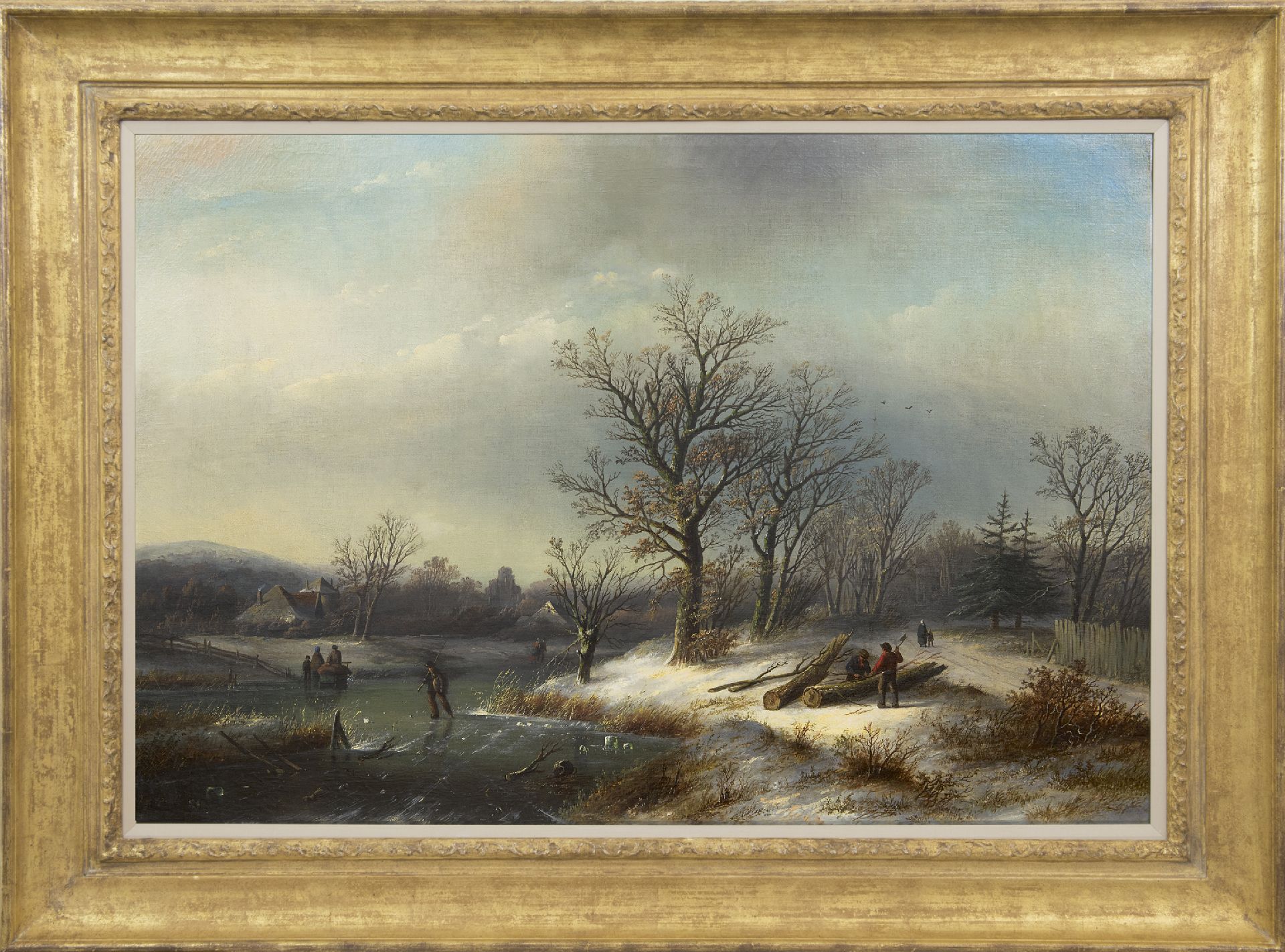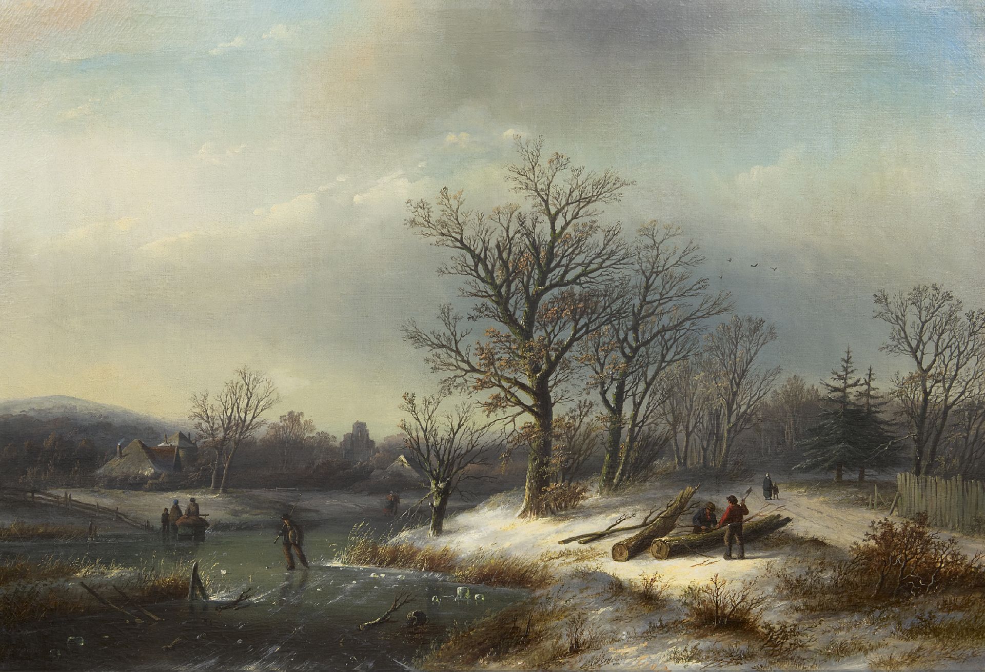Jacob Jan Coenraad Spohler kunstwerk • schilderij • voorheen te koop Winterlandschap met houthakkers en schaatsers