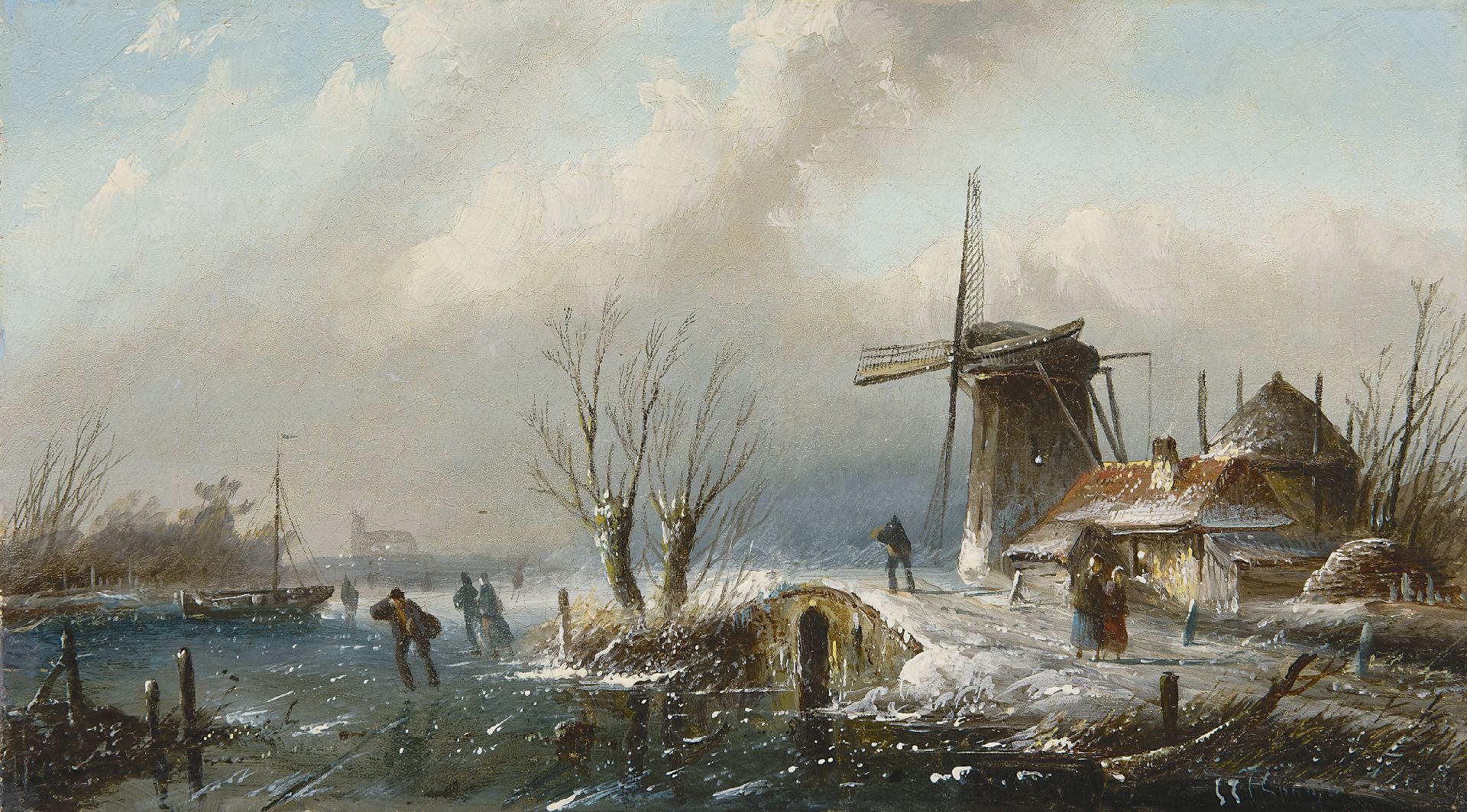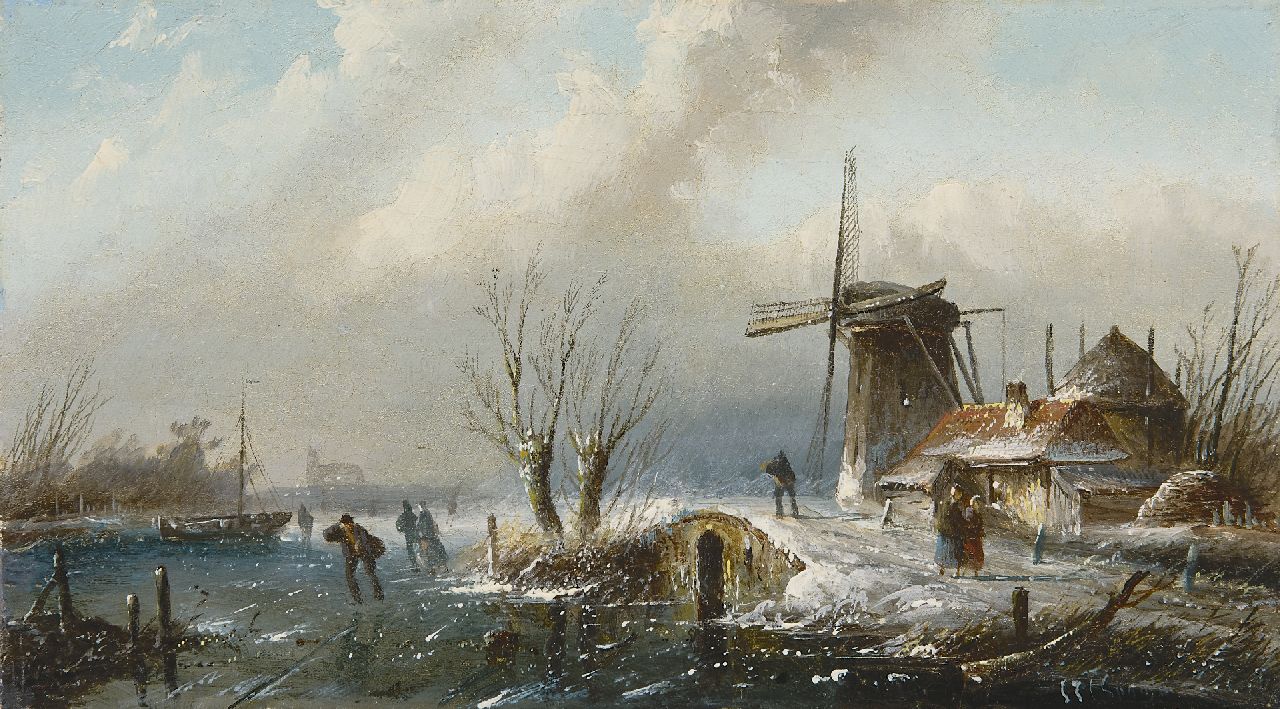 Jacob Jan Coenraad Spohler kunstwerk • schilderij • voorheen te koop Winterlandschap met schaatsers (pendant van 18684)