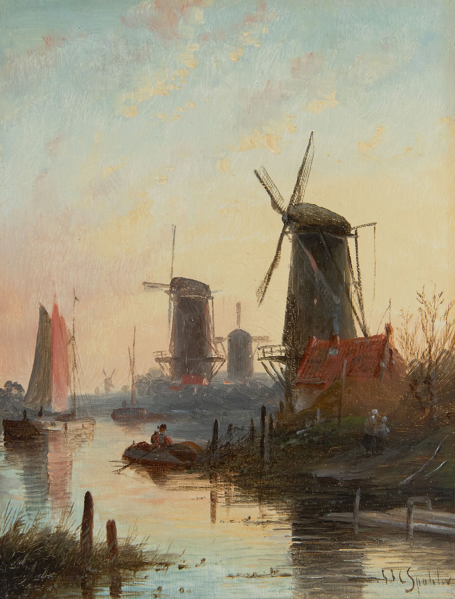 Jacob Jan Coenraad Spohler | Rivierlandschap met zeilschip, figuren en molen, olieverf op paneel, 16,0 x 11,9 cm