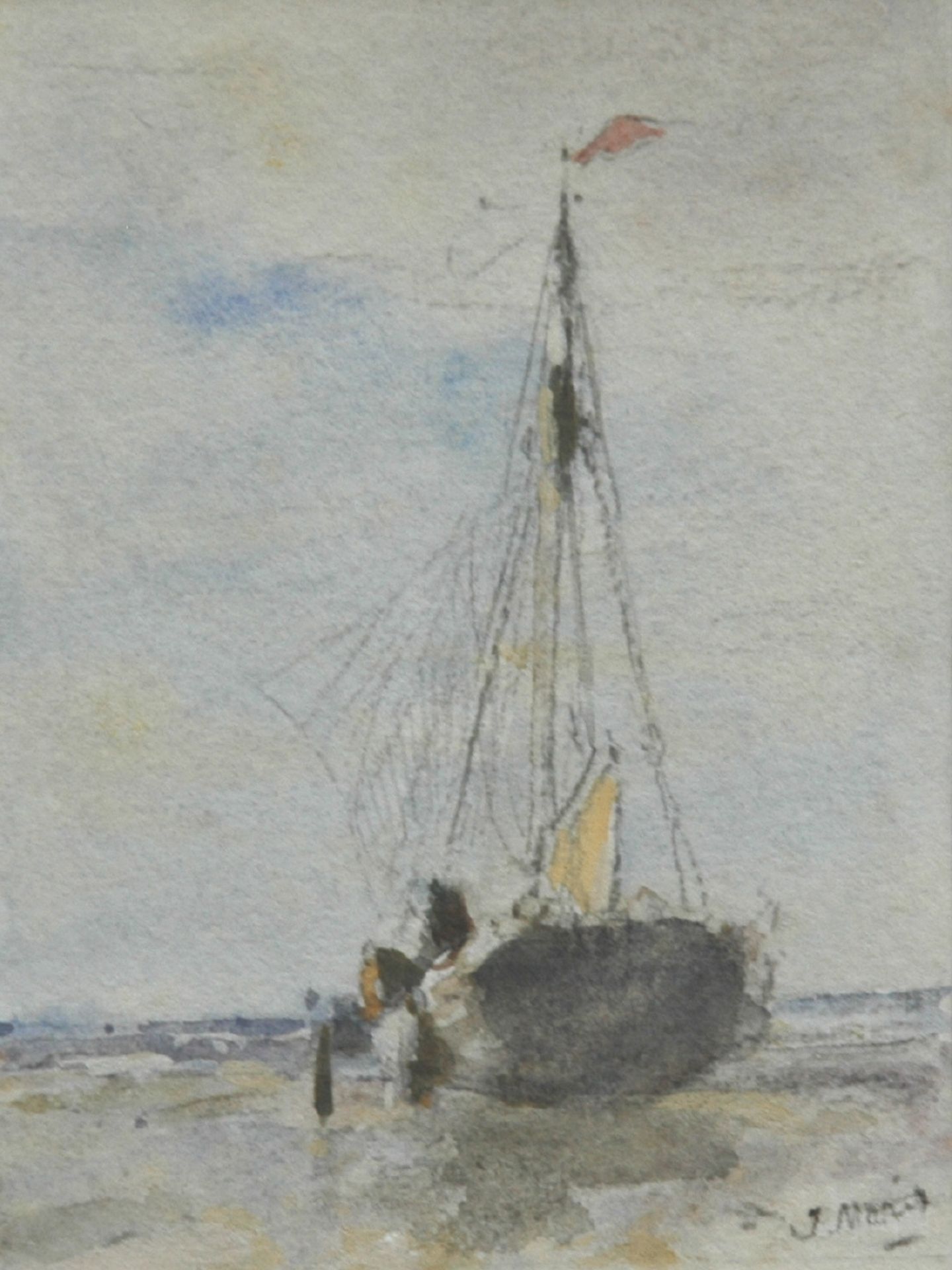 Jacob Maris kunstwerk • aquarel • tekening • voorheen te koop Menukaart met aquarel van een op het strand getrokken bomschuit