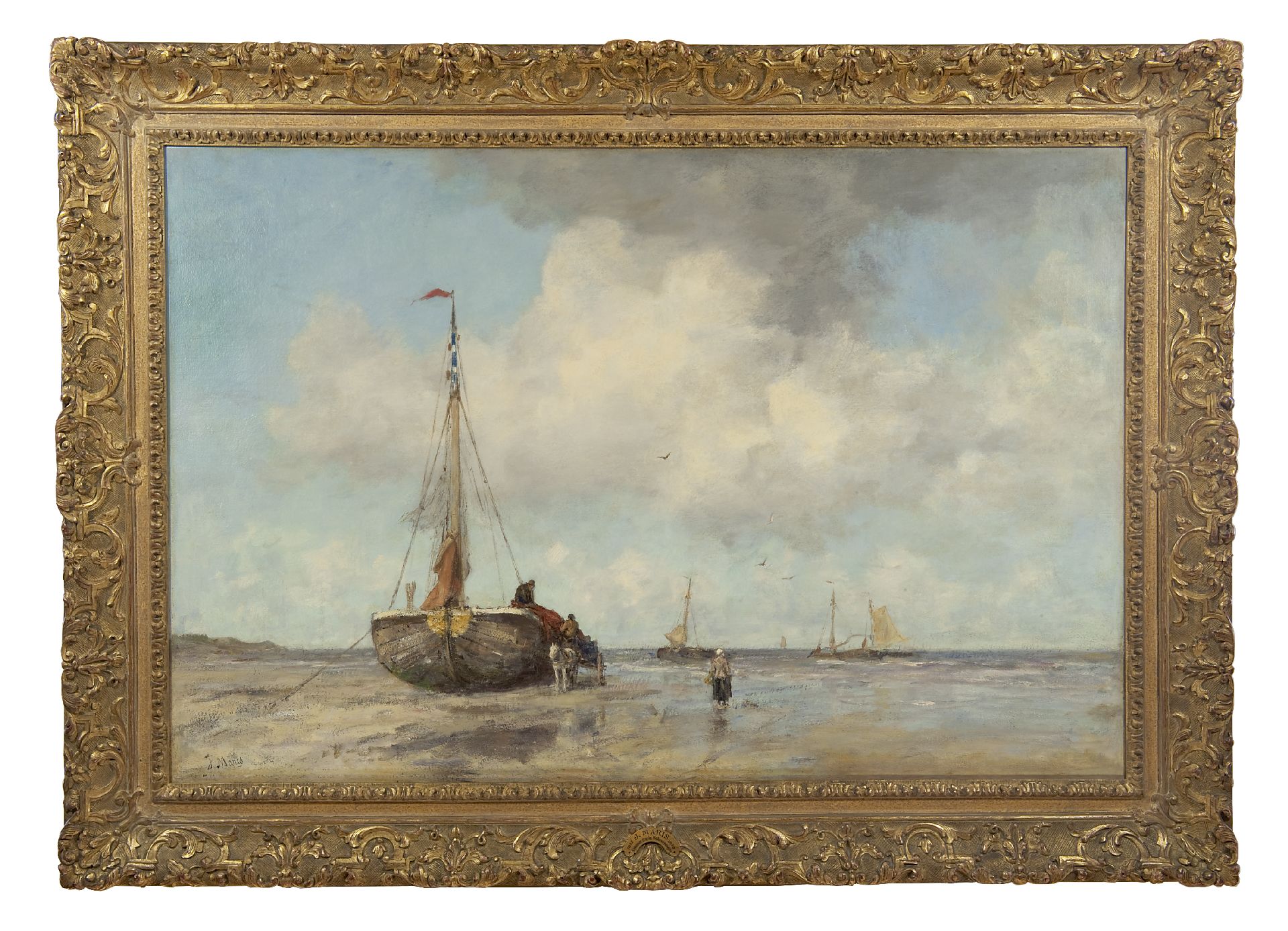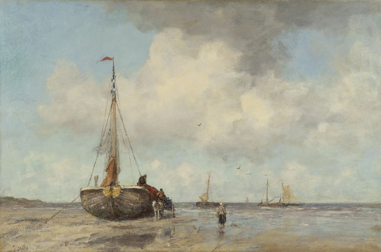 Jacob Maris kunstwerk • schilderij • voorheen te koop Bomschuit op het strand van Scheveningen