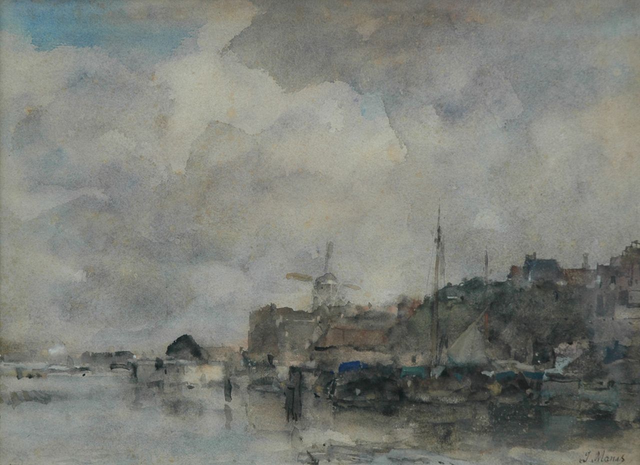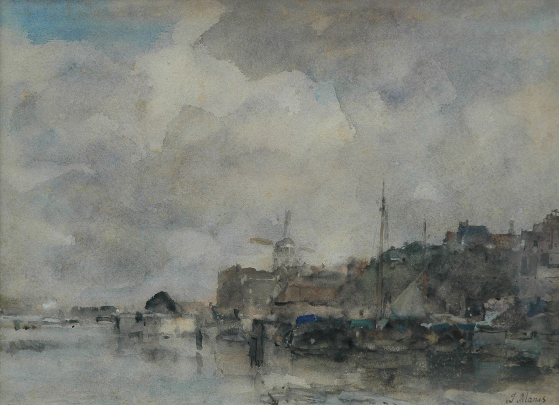 Jacob Maris kunstwerk • aquarel • tekening • voorheen te koop Gezicht op een Hollandse haven
