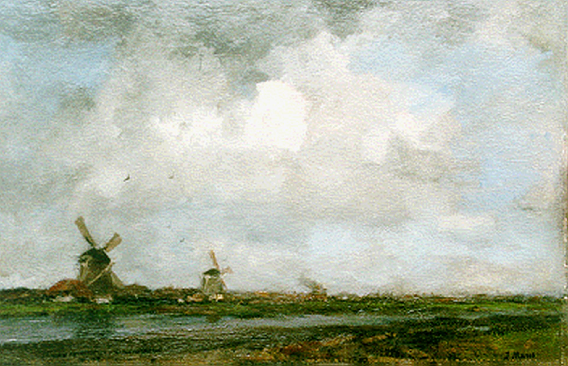 Jacob Maris kunstwerk • schilderij • voorheen te koop Molens langs een vaart bij Leiden