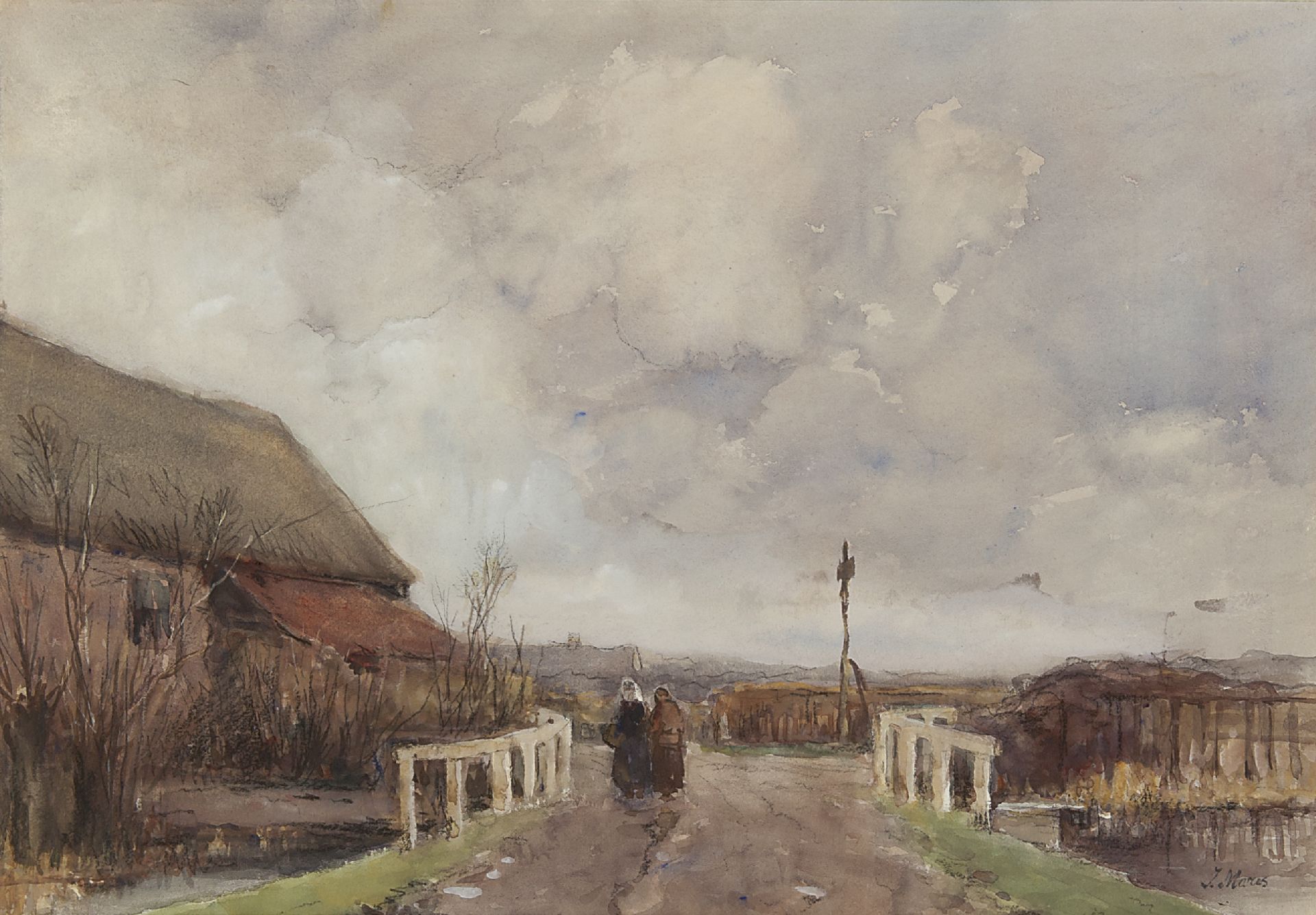 Jacob Maris kunstwerk • aquarel • tekening • voorheen te koop Op pad bij grauw weer