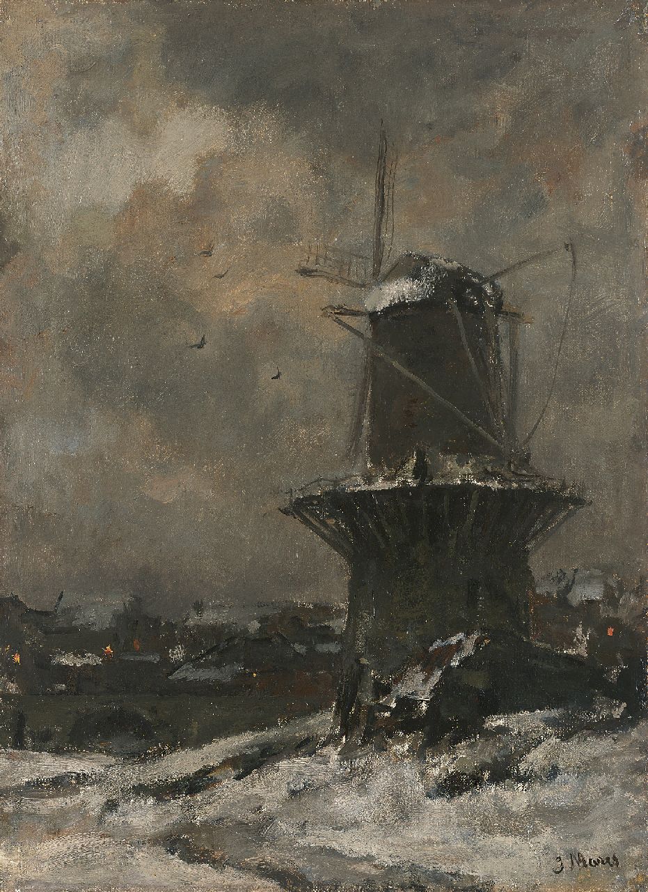 Jacob Maris kunstwerk • schilderij • voorheen te koop Stellingmolen in besneeuwd landschap bij avond