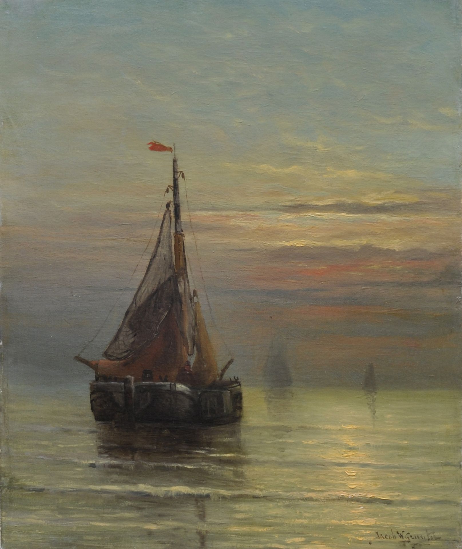 Jacob Willem Gruijter kunstwerk • schilderij • voorheen te koop Bomschuiten voor de Hollandse kust bij zonsondergang