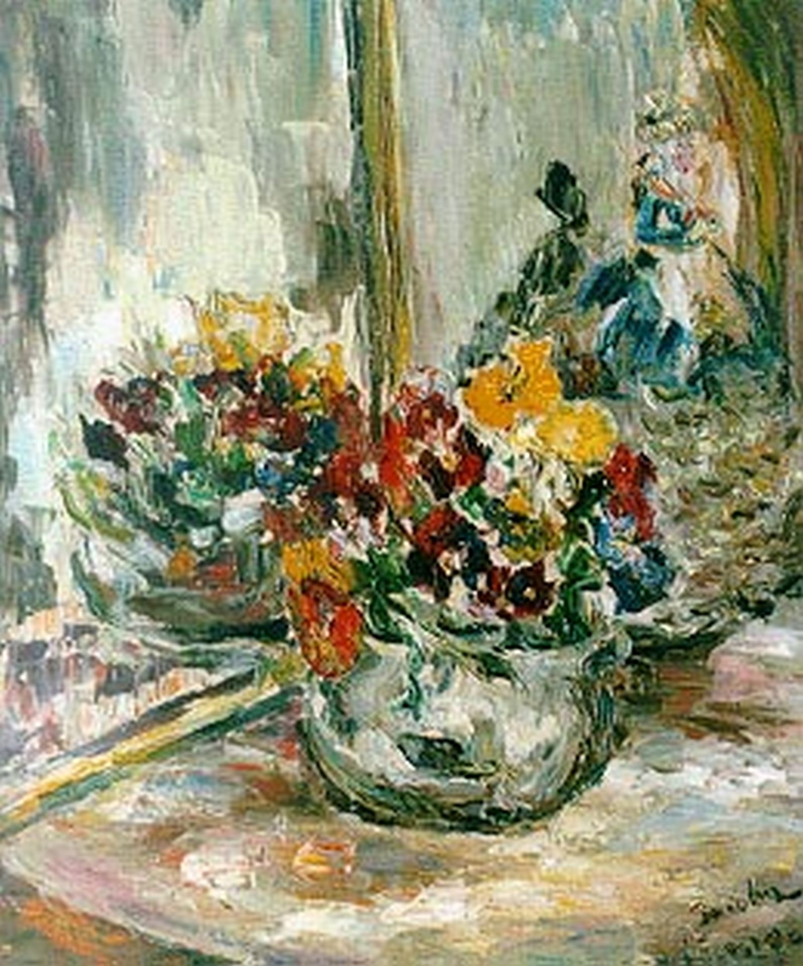 Jacoba Hendrika Wieringa kunstwerk • schilderij • voorheen te koop Bloemstilleven in vaas en pop voor spiegel