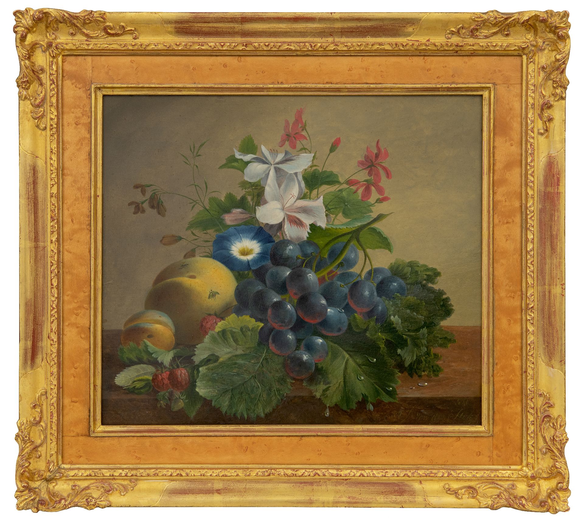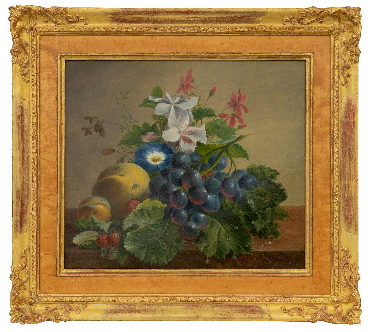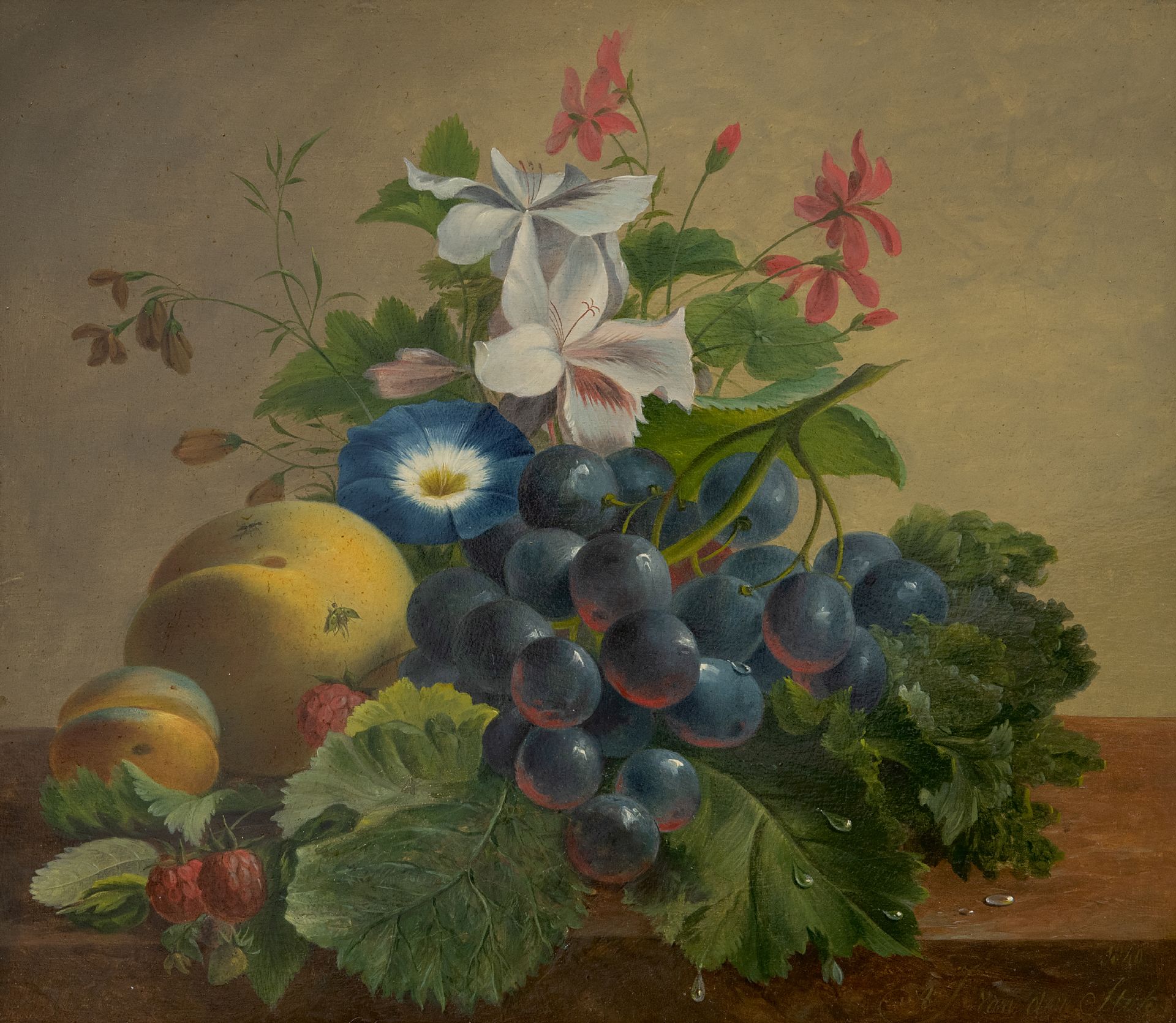 Jacoba van der Stok kunstwerk • schilderij • voorheen te koop Stilleven met bloemen en fruit op een plint
