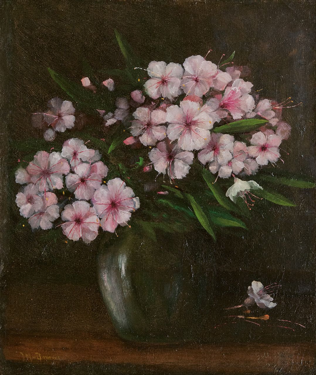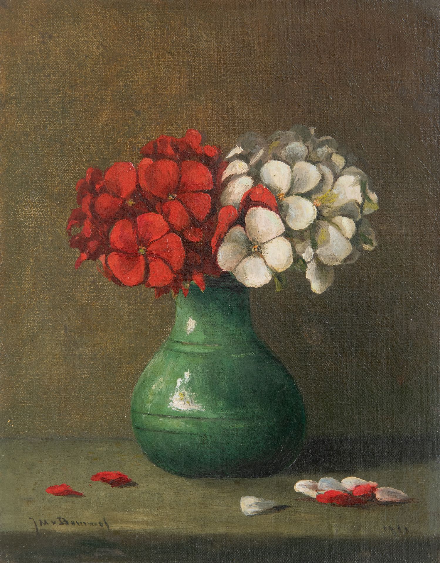 Jacobus Marinus van Bommel kunstwerk • schilderij • voorheen te koop Rode en witte geranium in groen vaasje