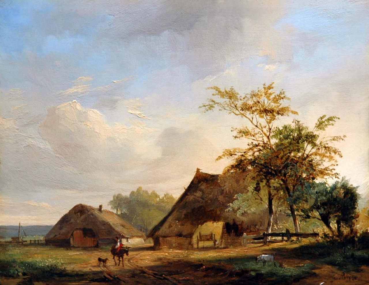 Jacobus Pelgrom kunstwerk • schilderij • voorheen te koop Boerenerf met vrouw op een muildier
