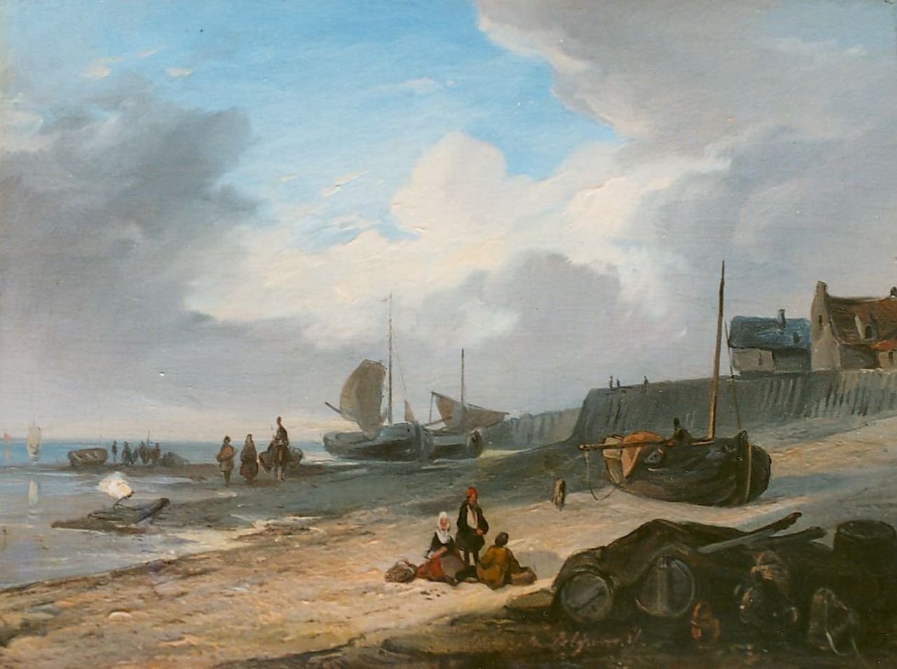 Jacobus Pelgrom kunstwerk • schilderij • voorheen te koop Kustgezicht met vissersboten op het strand