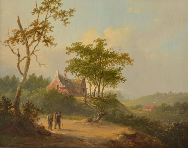 Stok J. van der | Jacobus van der Stok, Reizigers in panoramisch zomerlandschap, olieverf op paneel 25,7 x 32,6 cm
