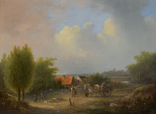 Jacobus van der Stok | Weids landschap met boerenvolk, olieverf op paneel, 19,3 x 26,0 cm