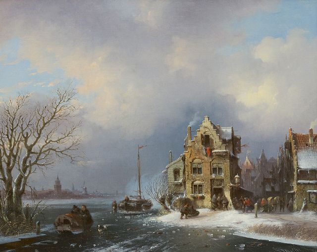Jacobus van der Stok | Bedrijvigheid in een stad aan een bevroren rivier, olieverf op doek, 40,8 x 50,6 cm, gesigneerd r.o. en gedateerd '59