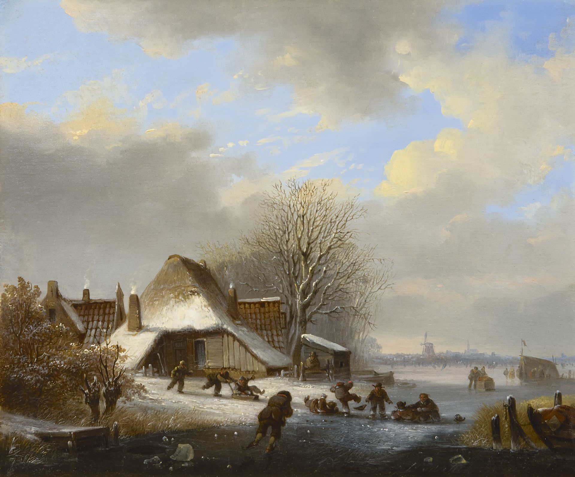 Jacobus van der Stok kunstwerk • schilderij • voorheen te koop Schaatspret op een bevroren rivier