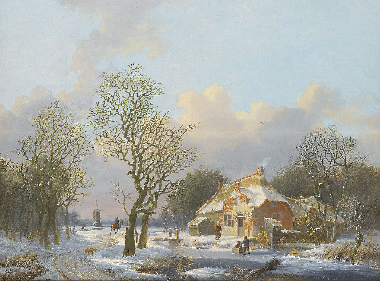Jacobus van der Stok kunstwerk • schilderij • voorheen te koop Winterlandschap met figuren bij een boerenhoeve