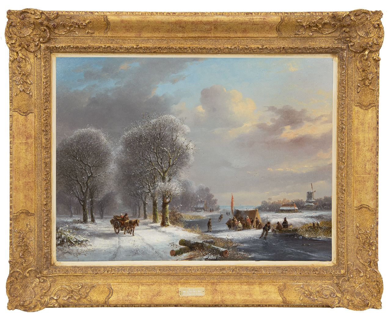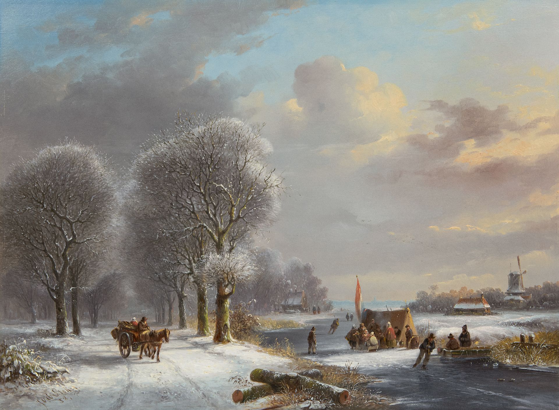 Jacobus van der Stok kunstwerk • schilderij • voorheen te koop Winterlandschap met schaatsers bij een koek-en-zopietent