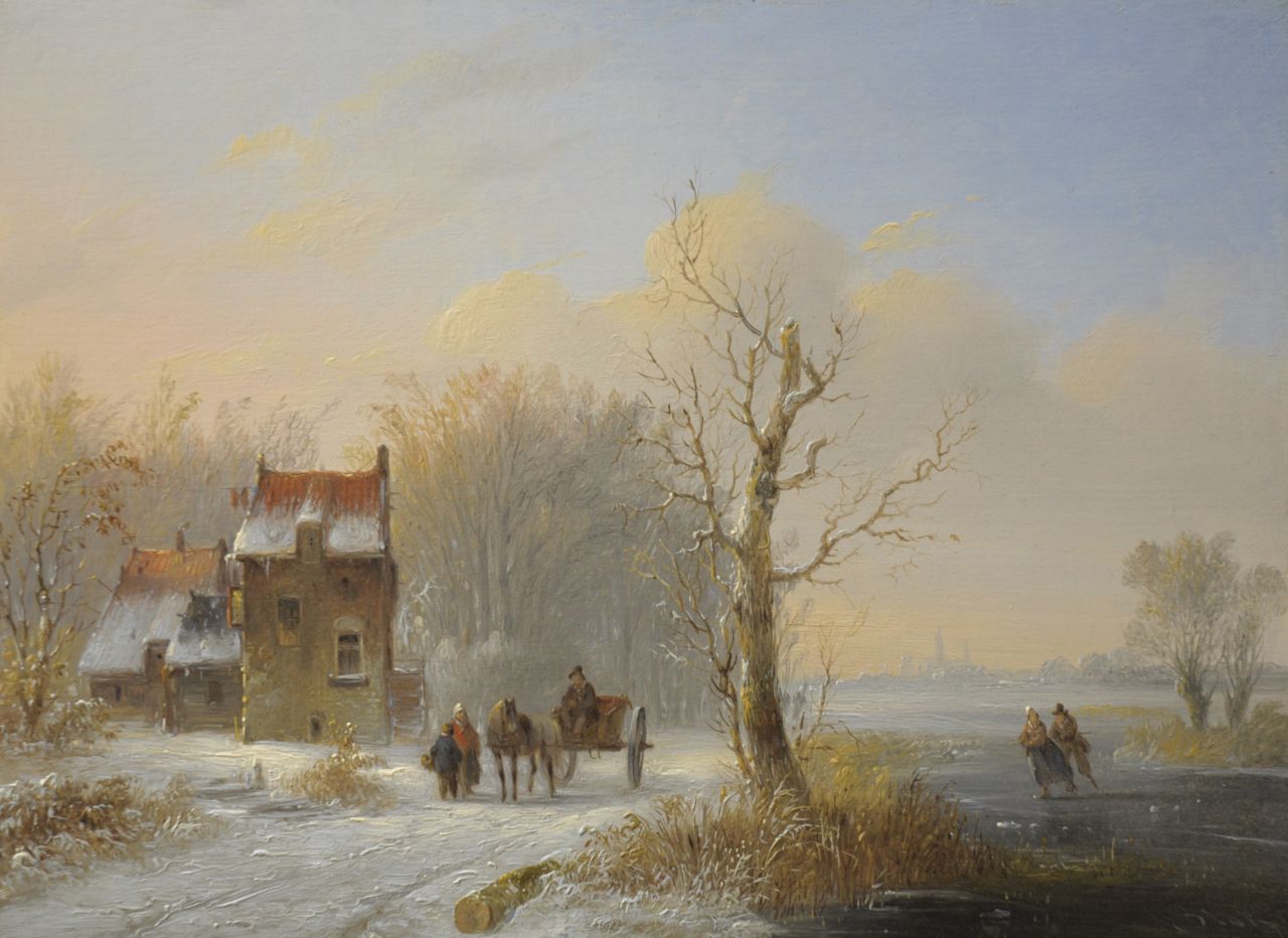 Jacobus van der Stok kunstwerk • schilderij • voorheen te koop Winters tafereel met paard en wagen en schaatsers