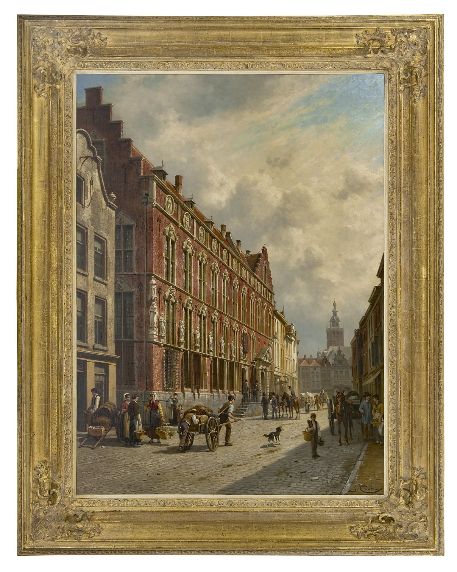 annotatie met authenticiteitsverklaring van de schilder op etiket op spieraam: ‘Je soussigne que le tableau ci contre représentant (Vue de l’Hotel de Ville a Nijmegen en Hollande) est peint par moi en Original J.F. Carabain Bruxelles 25 Juin 1885’.