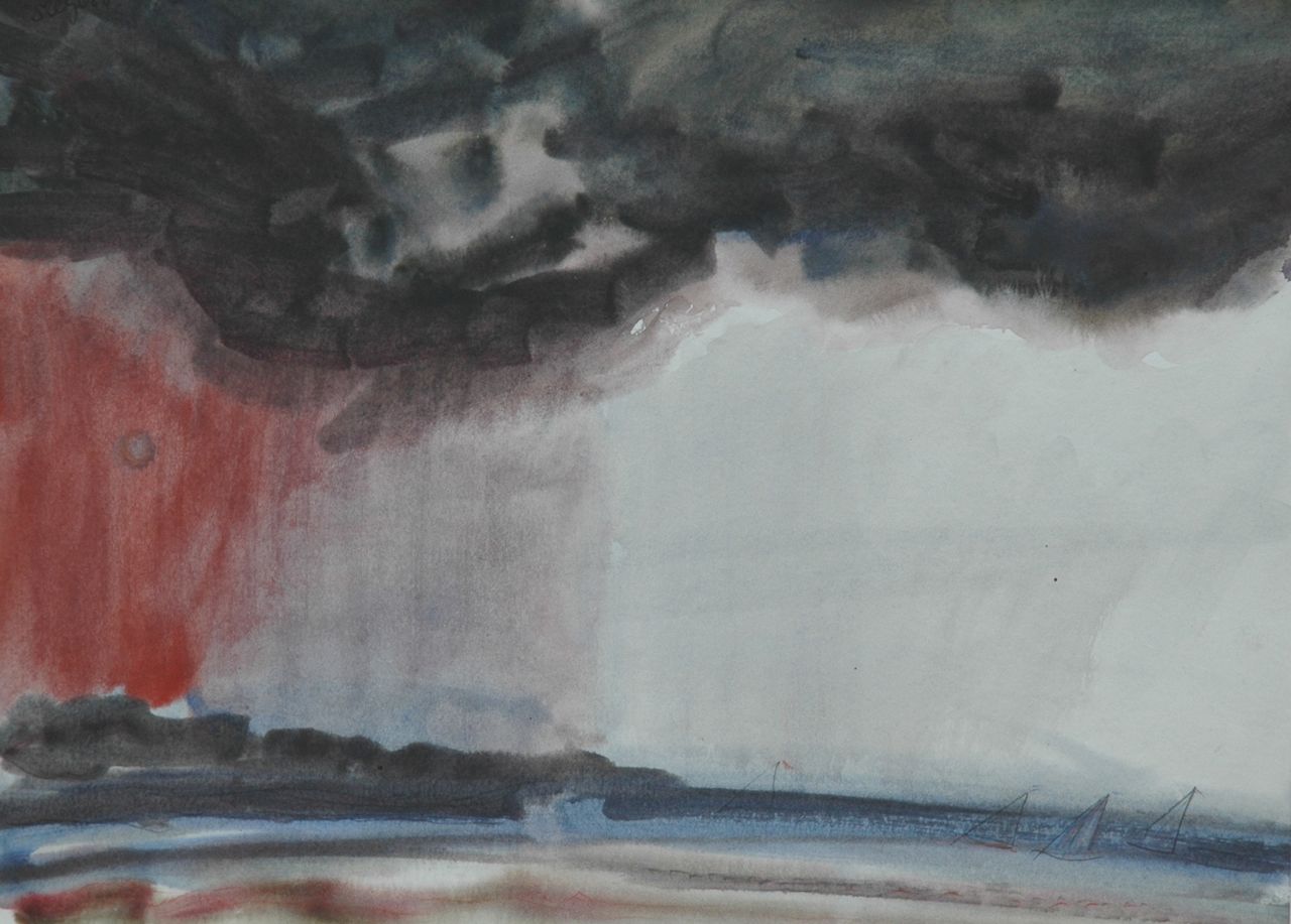 Jacques Slegers kunstwerk • aquarel • tekening • voorheen te koop Bootjes bij wolkbreuk