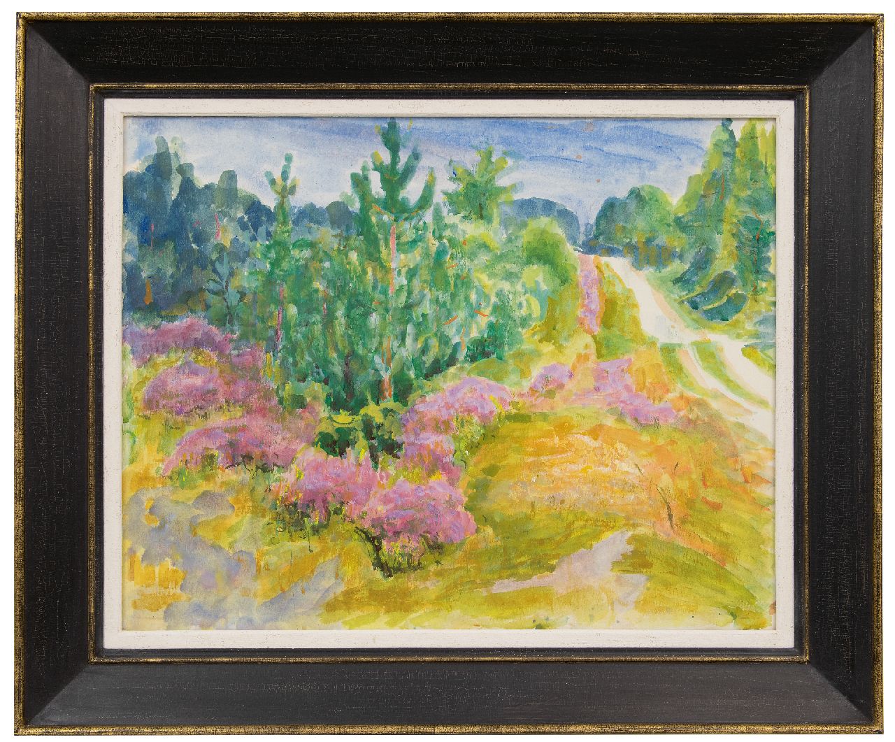 Jan Altink kunstwerk • aquarel • tekening • voorheen te koop Landweg door dennenbos en bloeiende heide