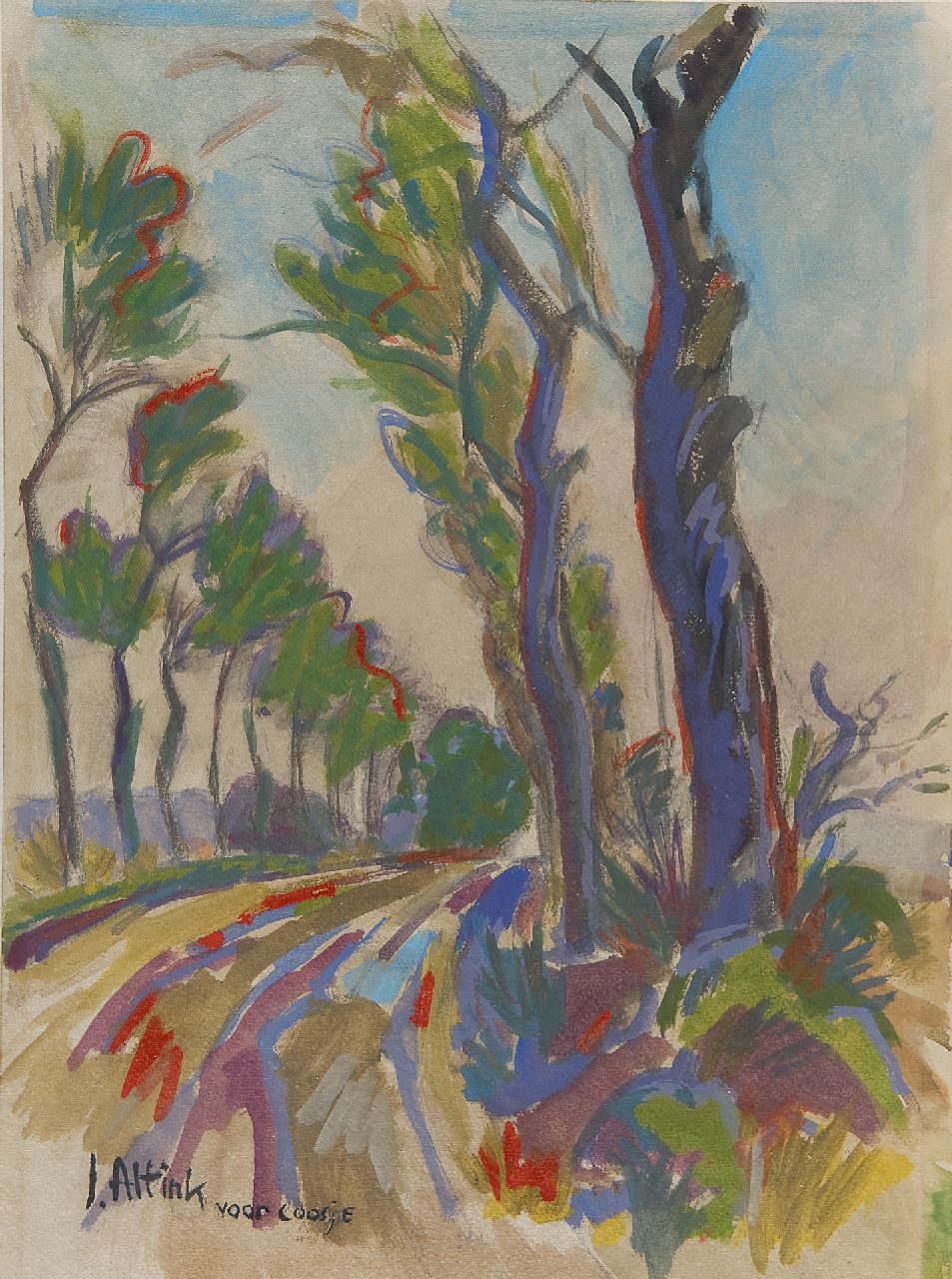 Jan Altink kunstwerk • aquarel • tekening • voorheen te koop Landweg met bomen