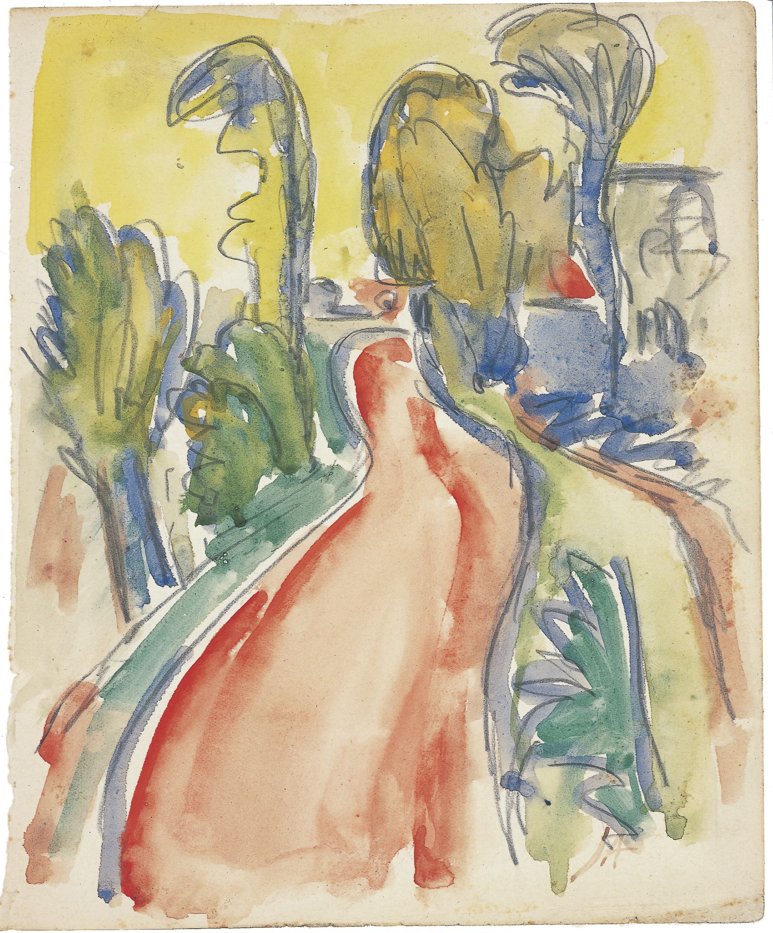 Jan Altink kunstwerk • aquarel • tekening • voorheen te koop Rode weg tussen bomen