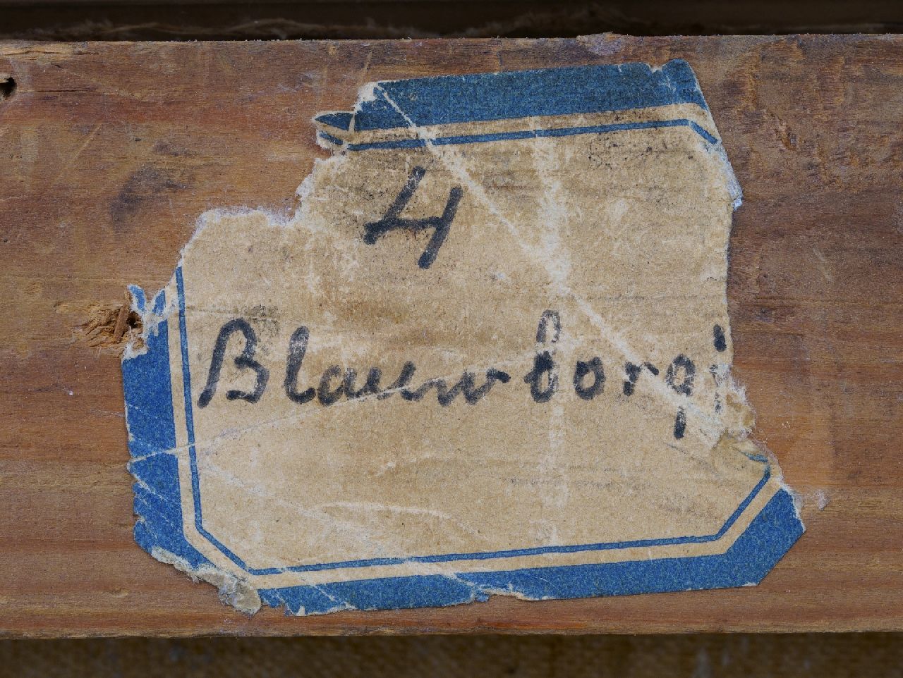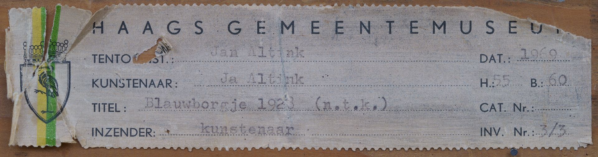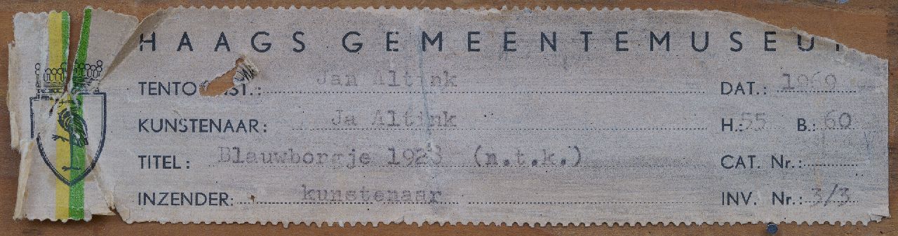 annotatie op etiket op spieraam: '4 Blauwborgje' en op spieraam: 'Voor Nelly' (Nelly Hubbeling, Altinks latere echtgenote).