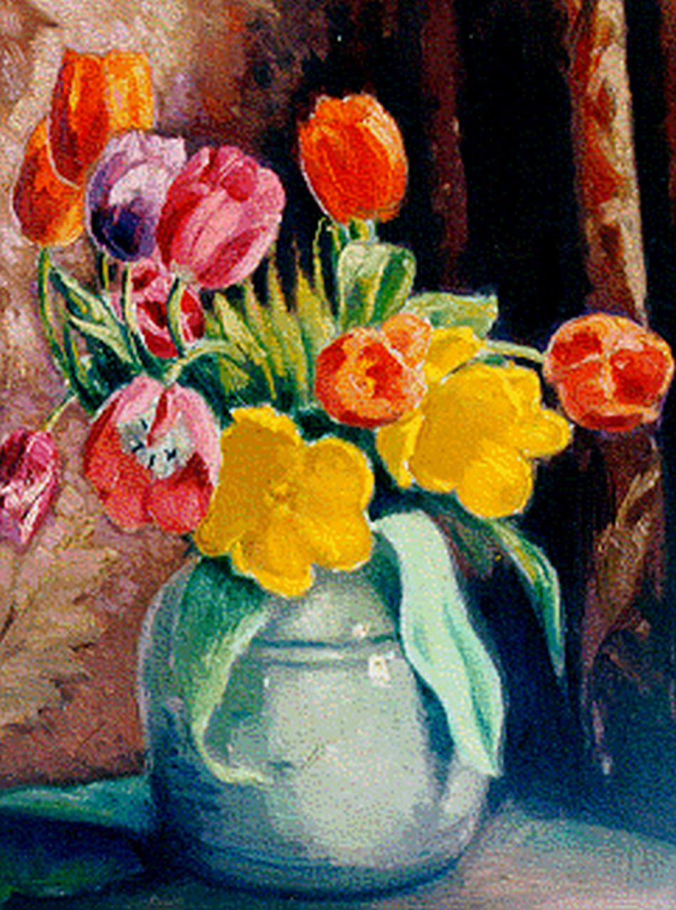 Jan Altink kunstwerk • schilderij • voorheen te koop Bloemstilleven van tulpen in een vaas