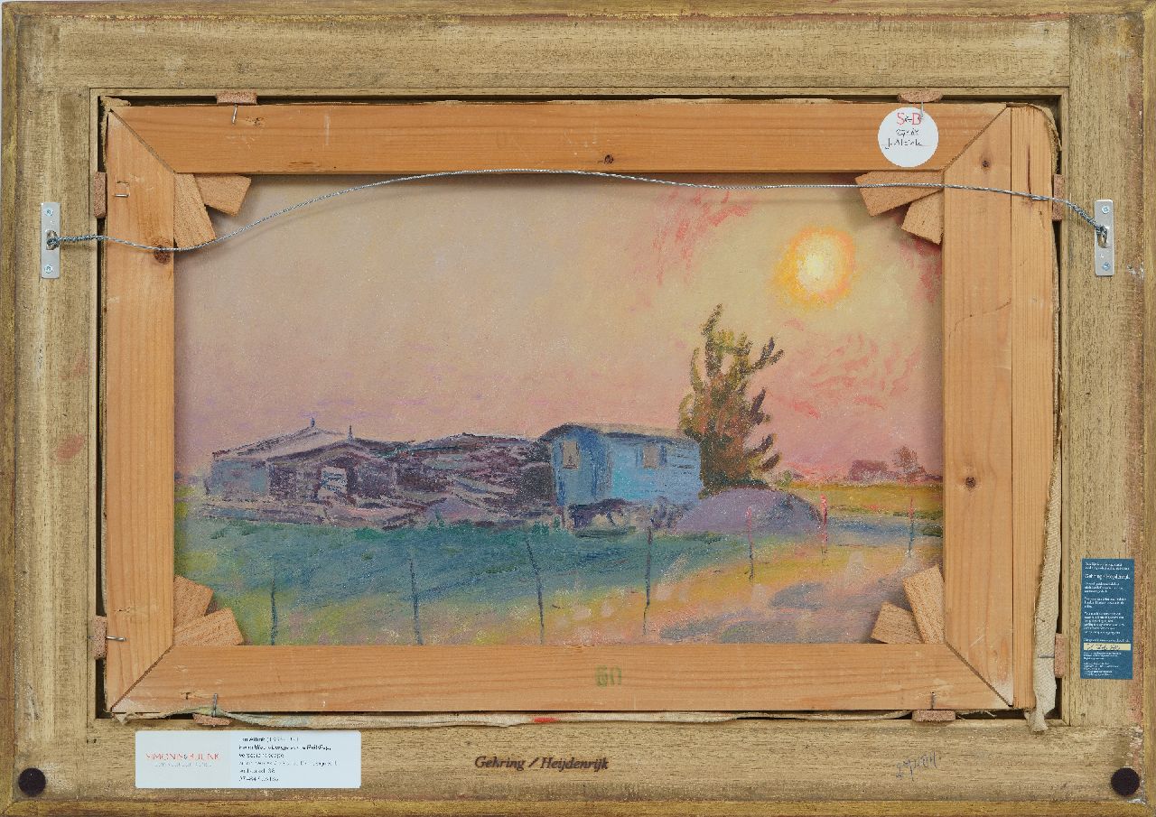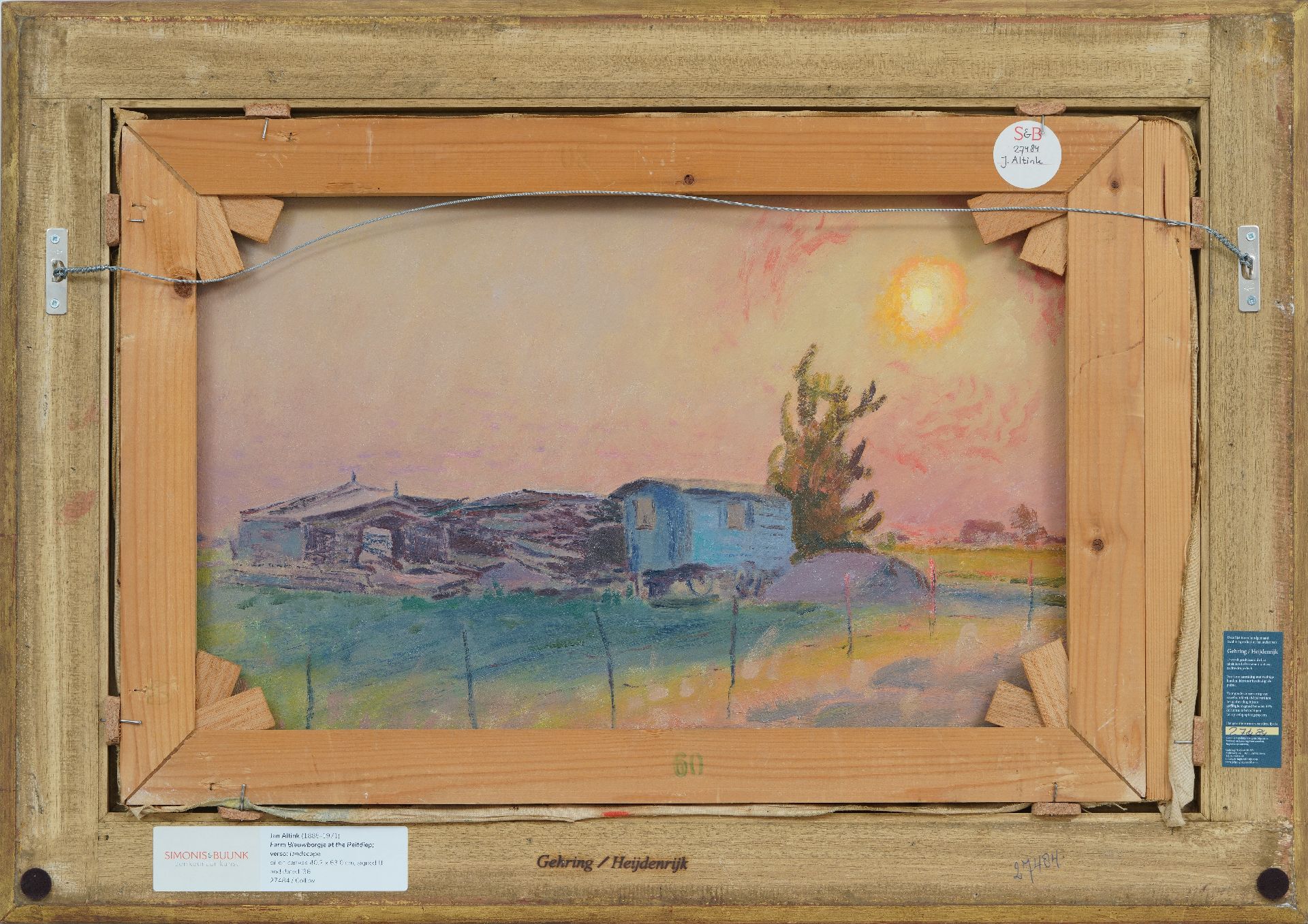 Jan Altink kunstwerk • schilderij • te koop Boerderij Blauwborgje aan het Reitdiep; verso: landschap met loods en schaftkeet