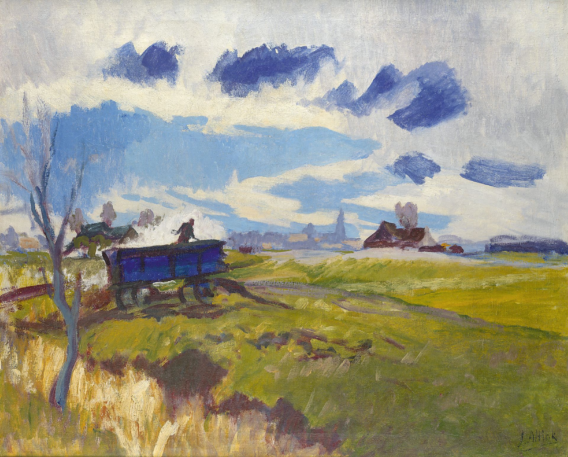 Jan Altink kunstwerk • schilderij • voorheen te koop Gronings landschap met blauwe kar