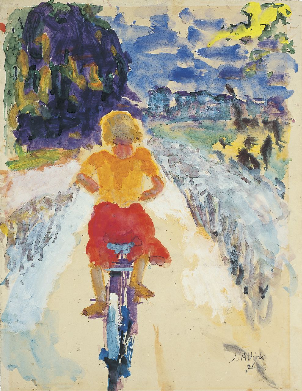 Jan Altink kunstwerk • aquarel • tekening • voorheen te koop Meisje op de fiets
