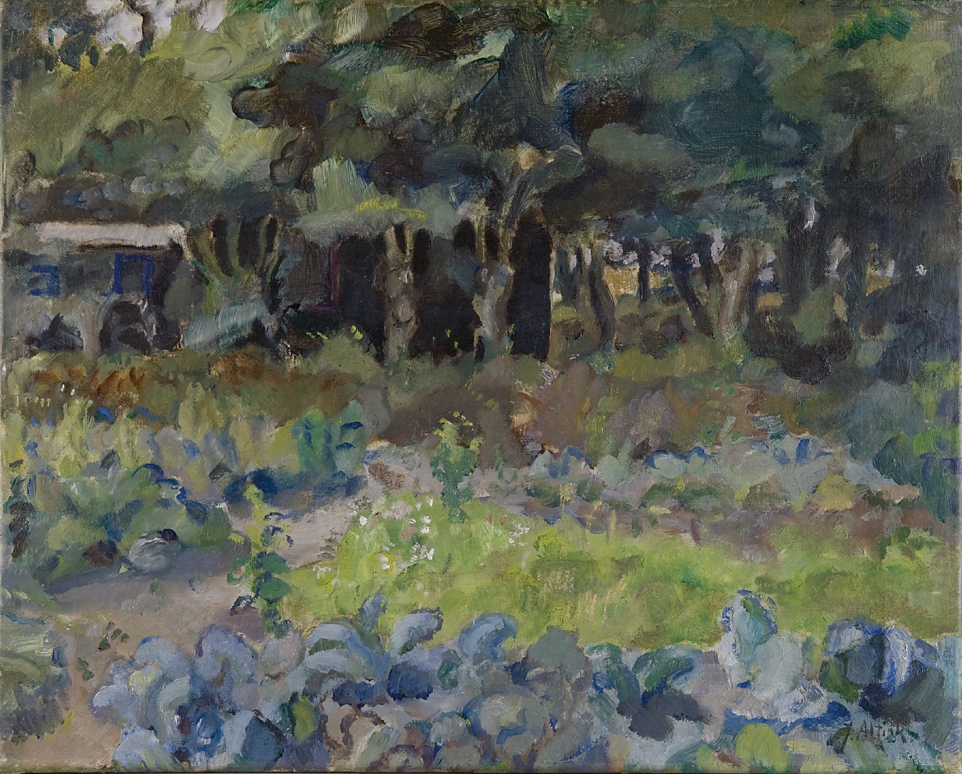 Jan Altink kunstwerk • schilderij • voorheen te koop Moestuin met schuur