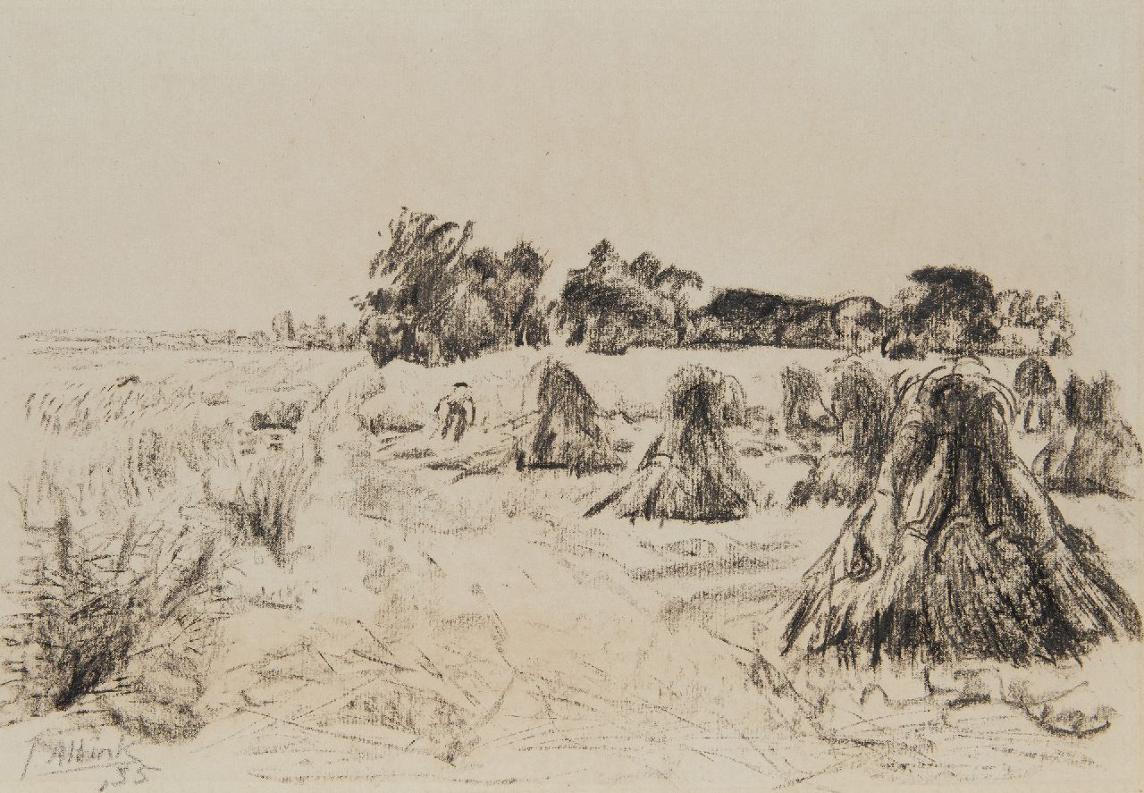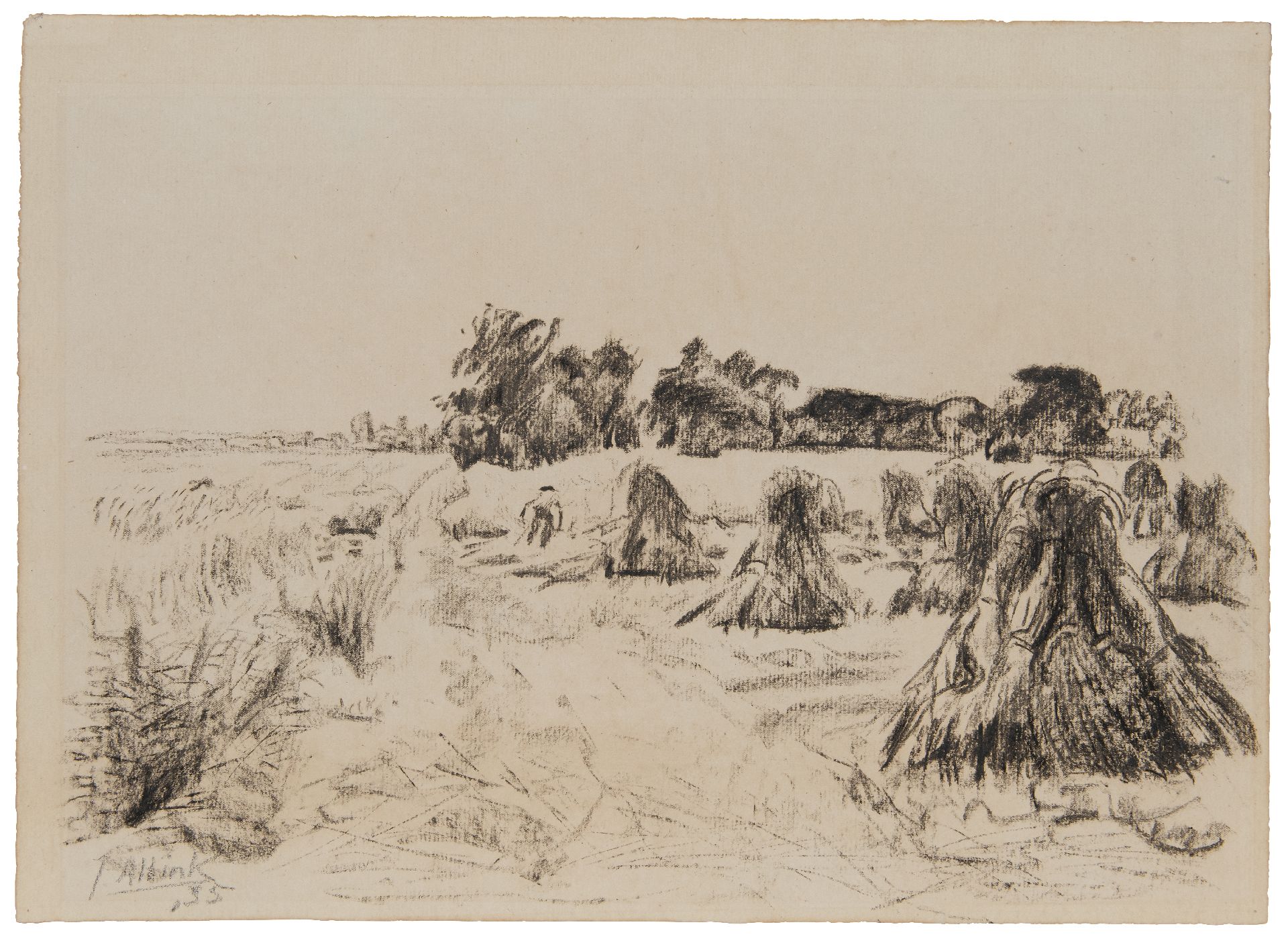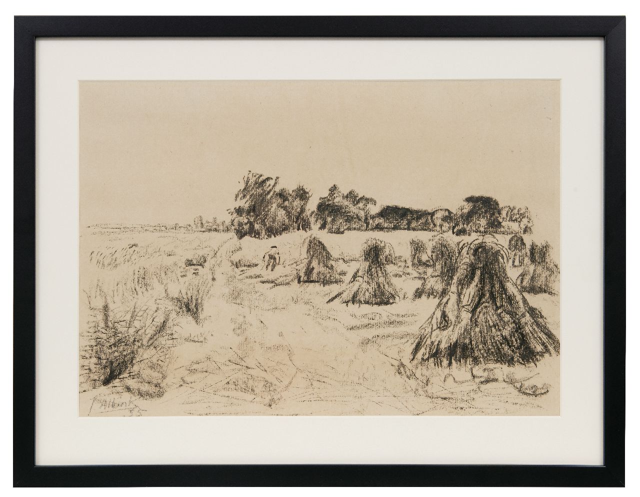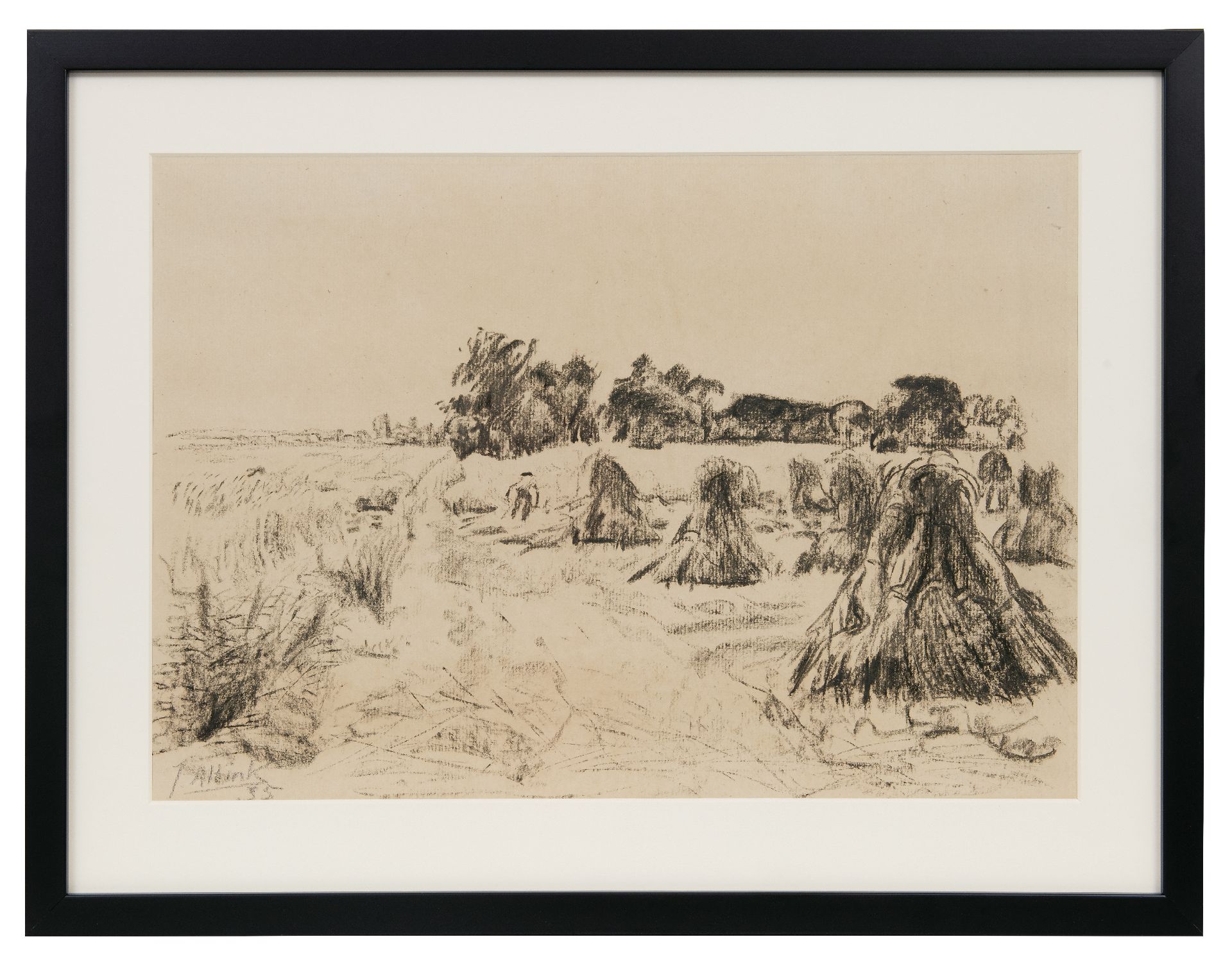 Jan Altink kunstwerk • aquarel • tekening • voorheen te koop Oogstlandschap met korenschoven
