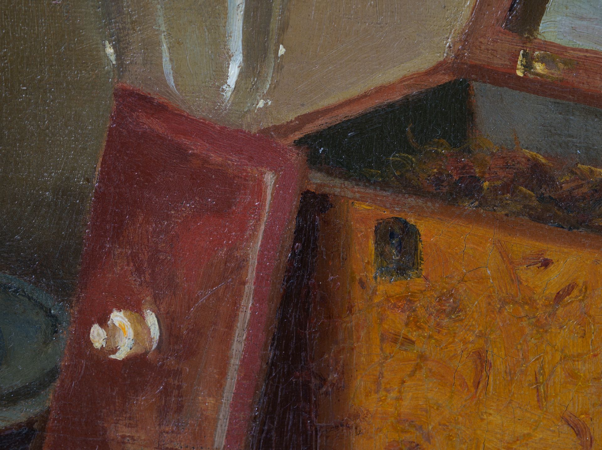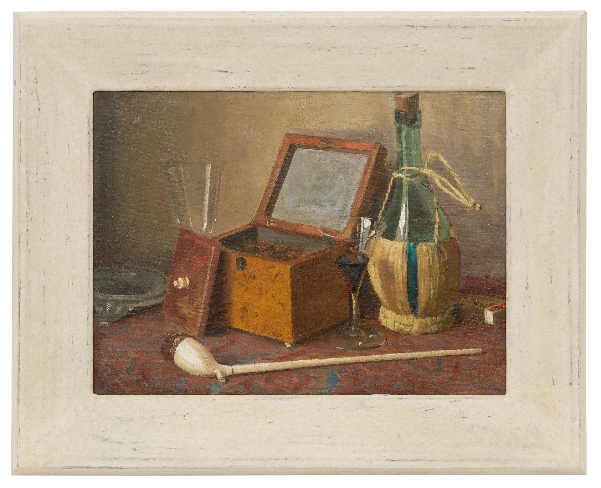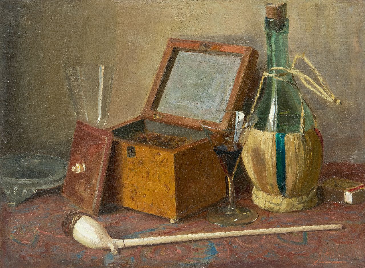 Jan Altink kunstwerk • schilderij • te koop Stilleven van Altinks tabakskistje, pijp en wijnfles