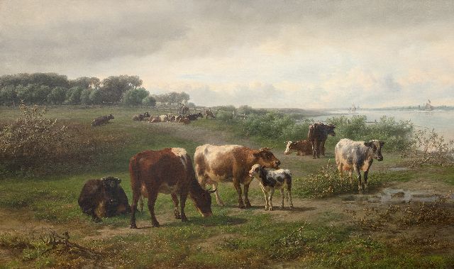 Jan Bedijs Tom | Koeien langs een rivier, mogelijk de Rijn in Gelderland, olieverf op doek, 72,3 x 122,5 cm, gesigneerd r.o. en gedateerd 1874