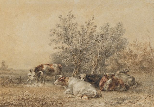 Jan Bedijs Tom | Koeien bij een wilgenbosje, inkt en aquarel op papier, 20,7 x 30,0 cm, gesigneerd r.o.