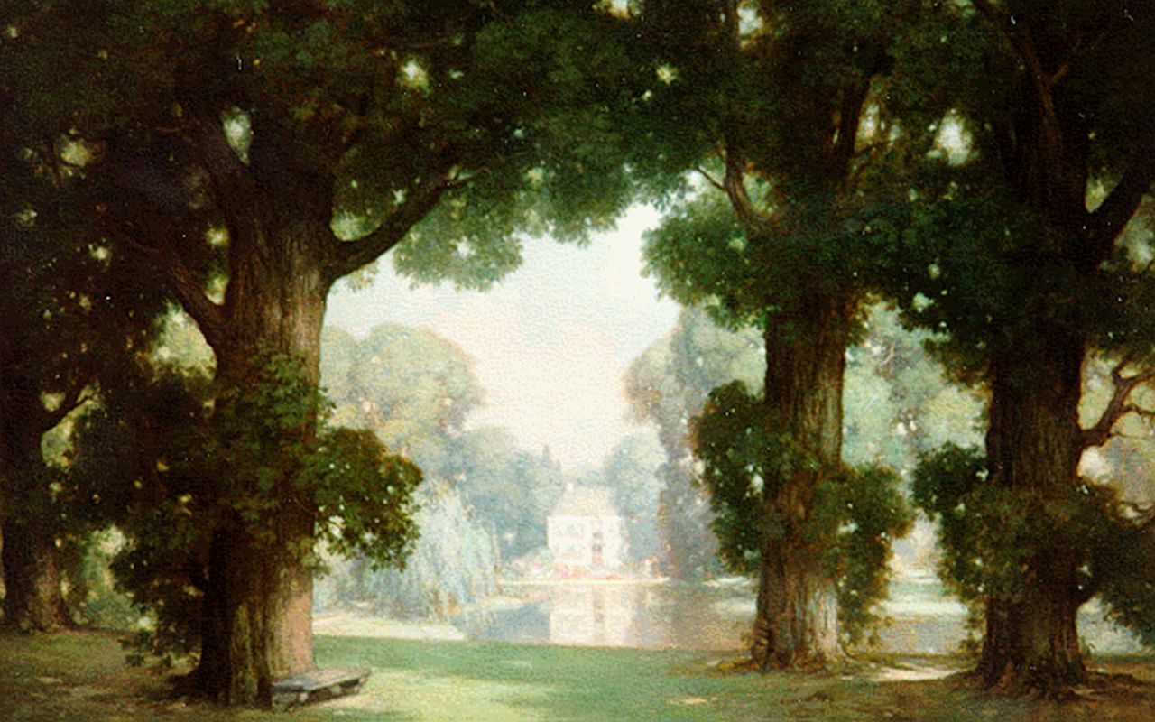 Jan Bogaerts kunstwerk • schilderij • voorheen te koop Gezicht op landhuis met parkvijver