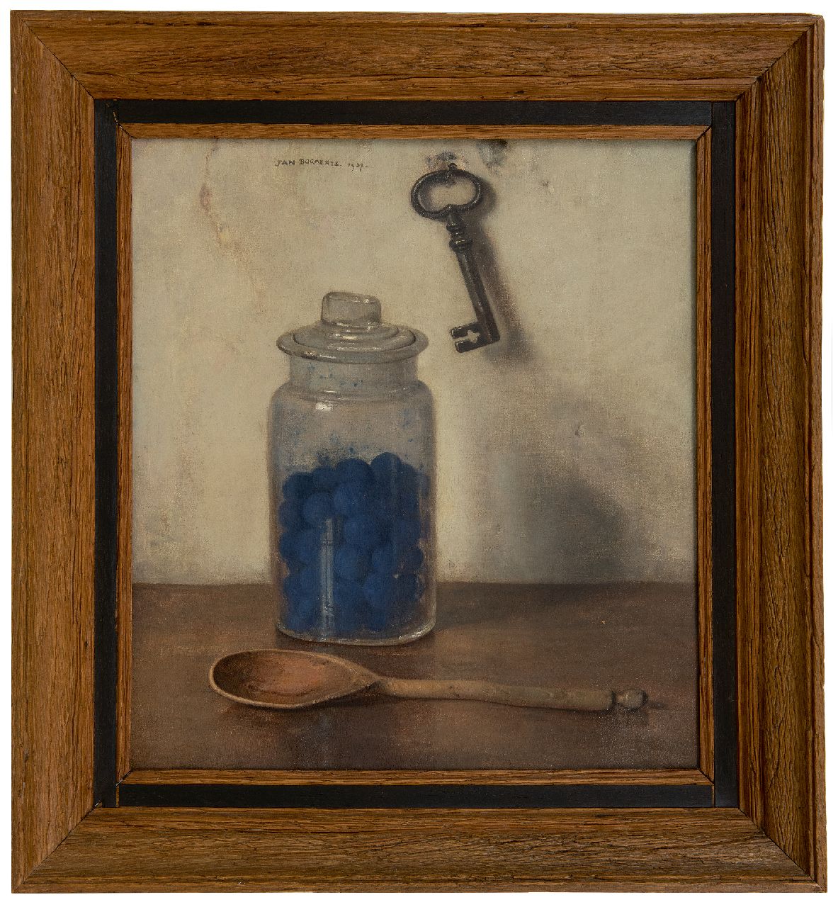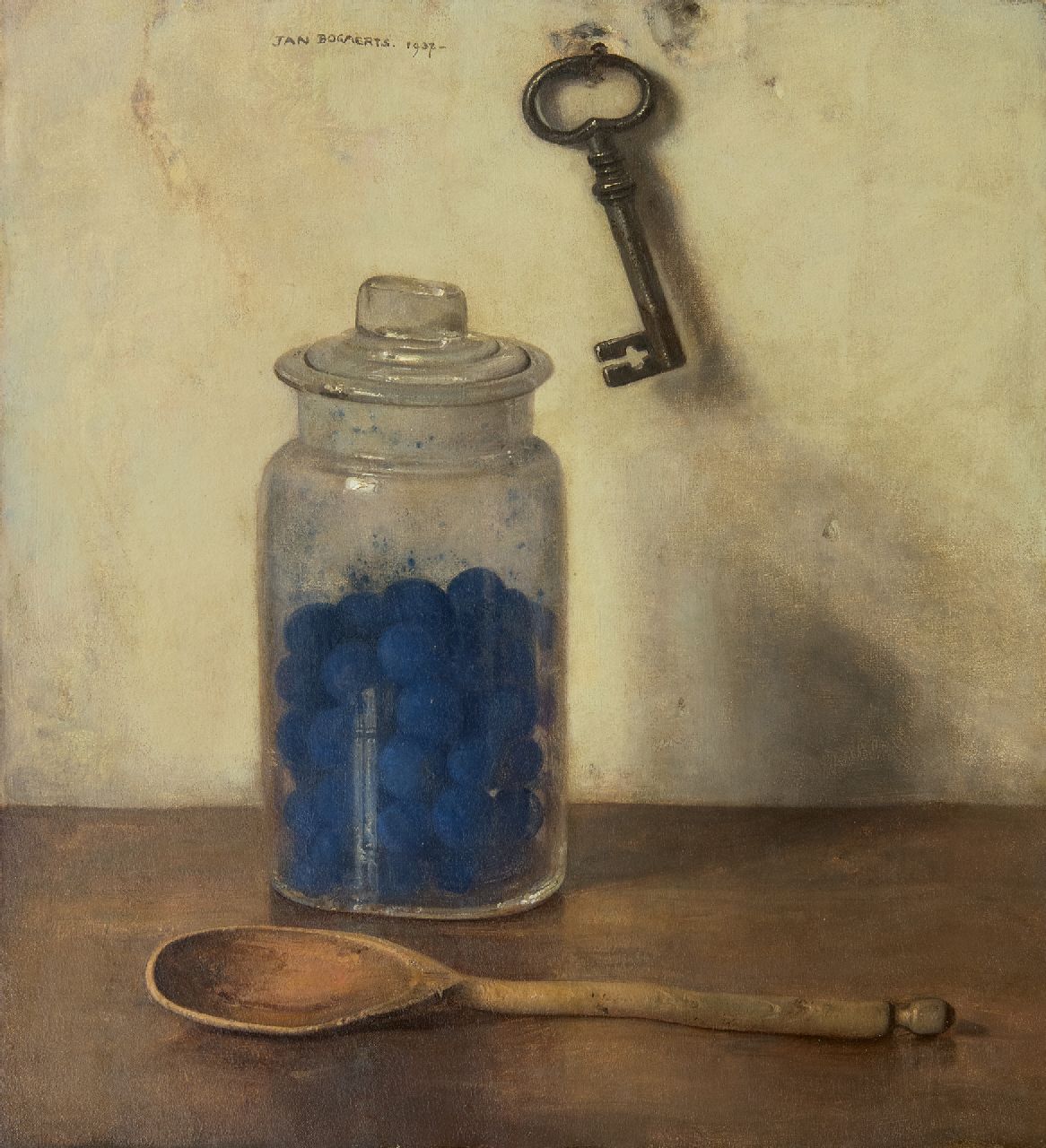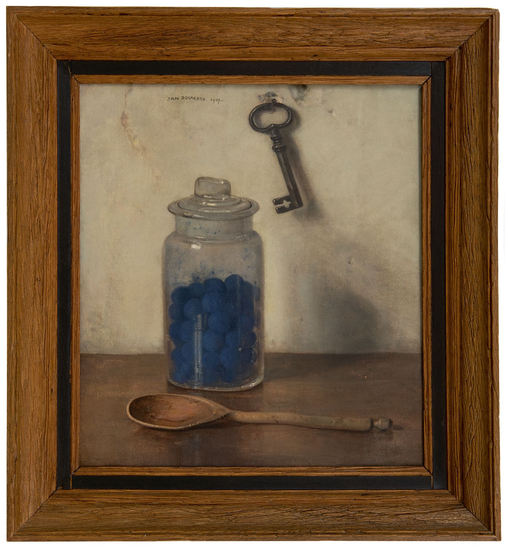 Jan Bogaerts kunstwerk • schilderij • te koop Glazen pot met blauwselbollen