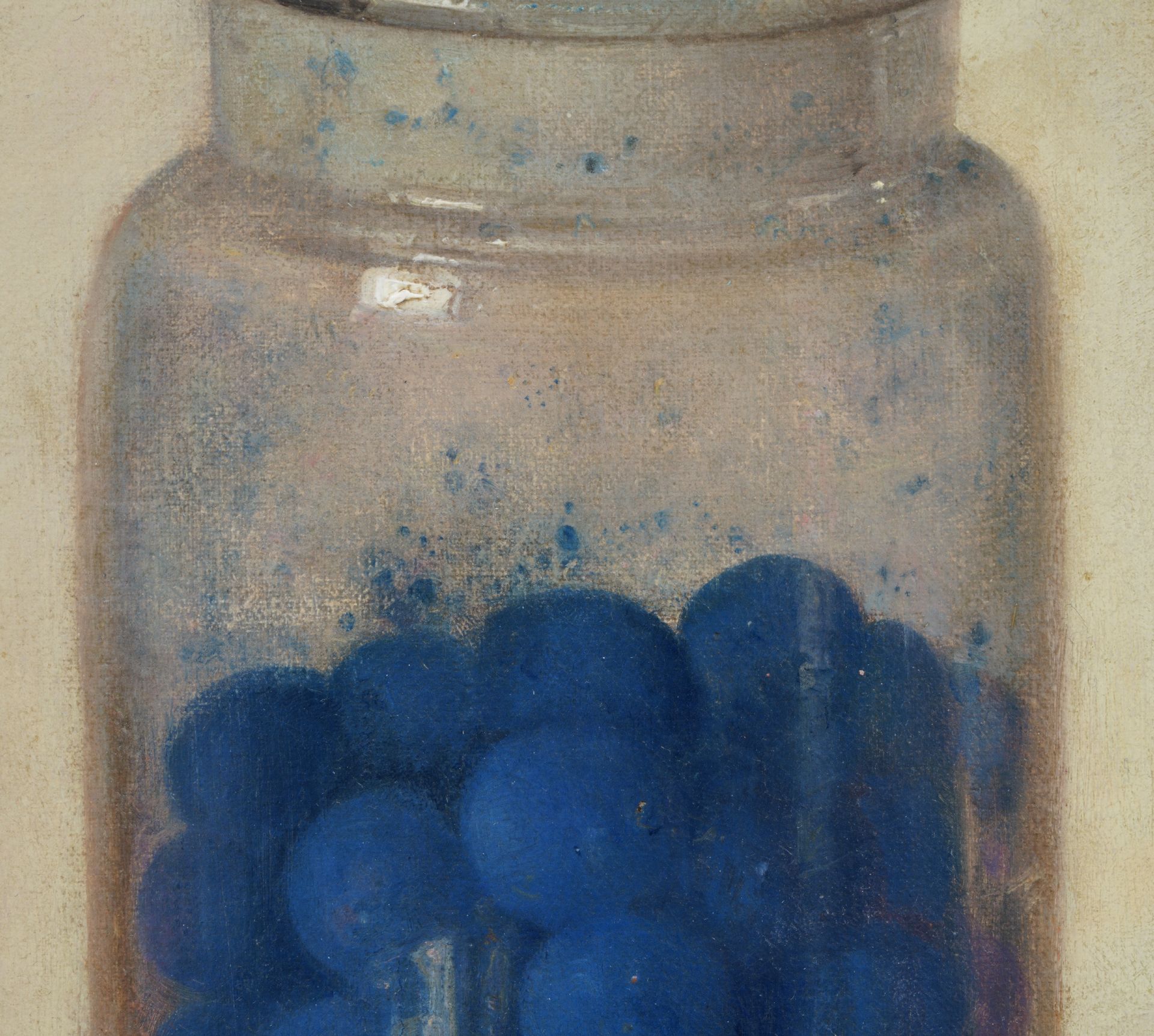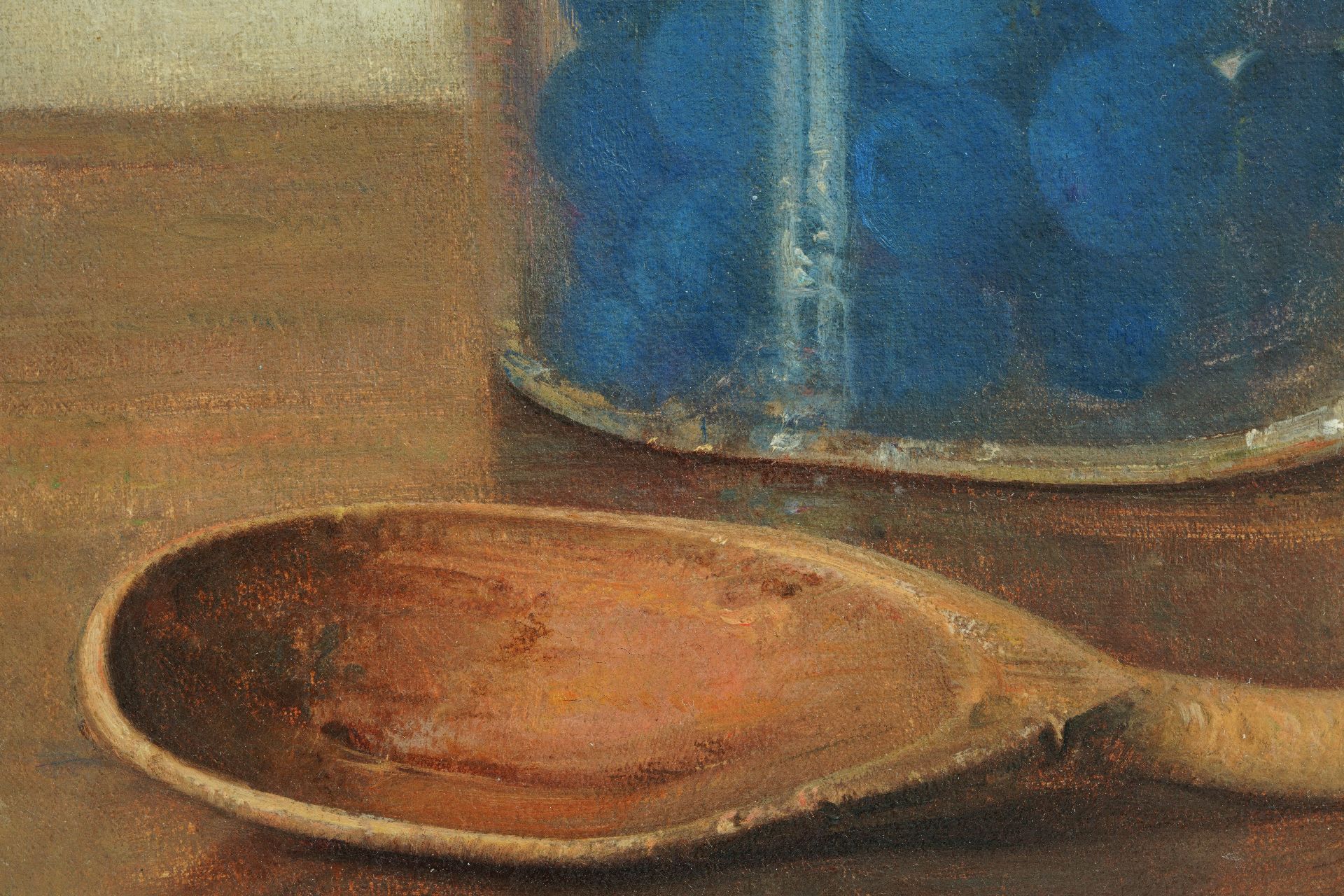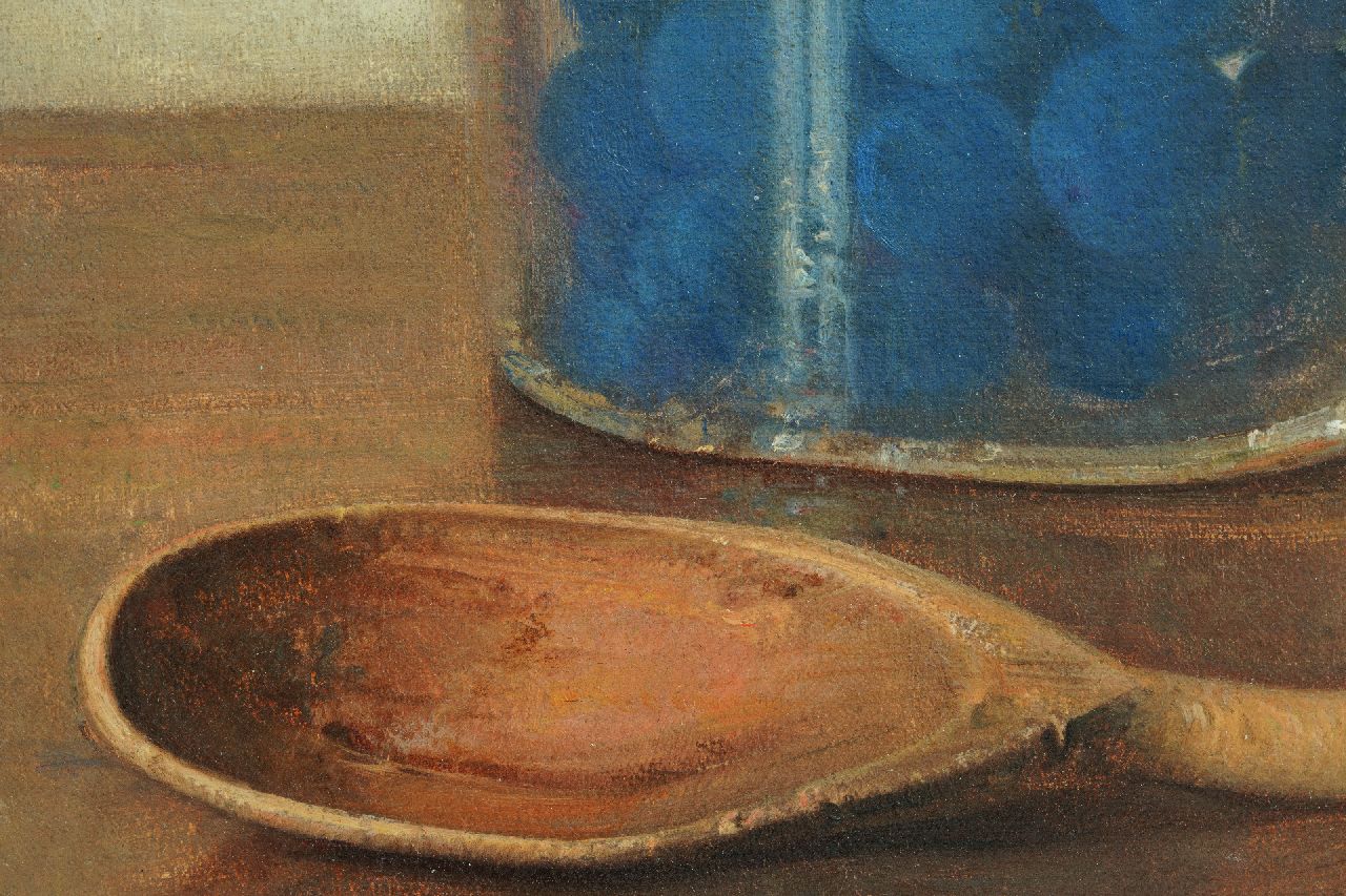 Jan Bogaerts kunstwerk • schilderij • te koop Glazen pot met blauwselbollen
