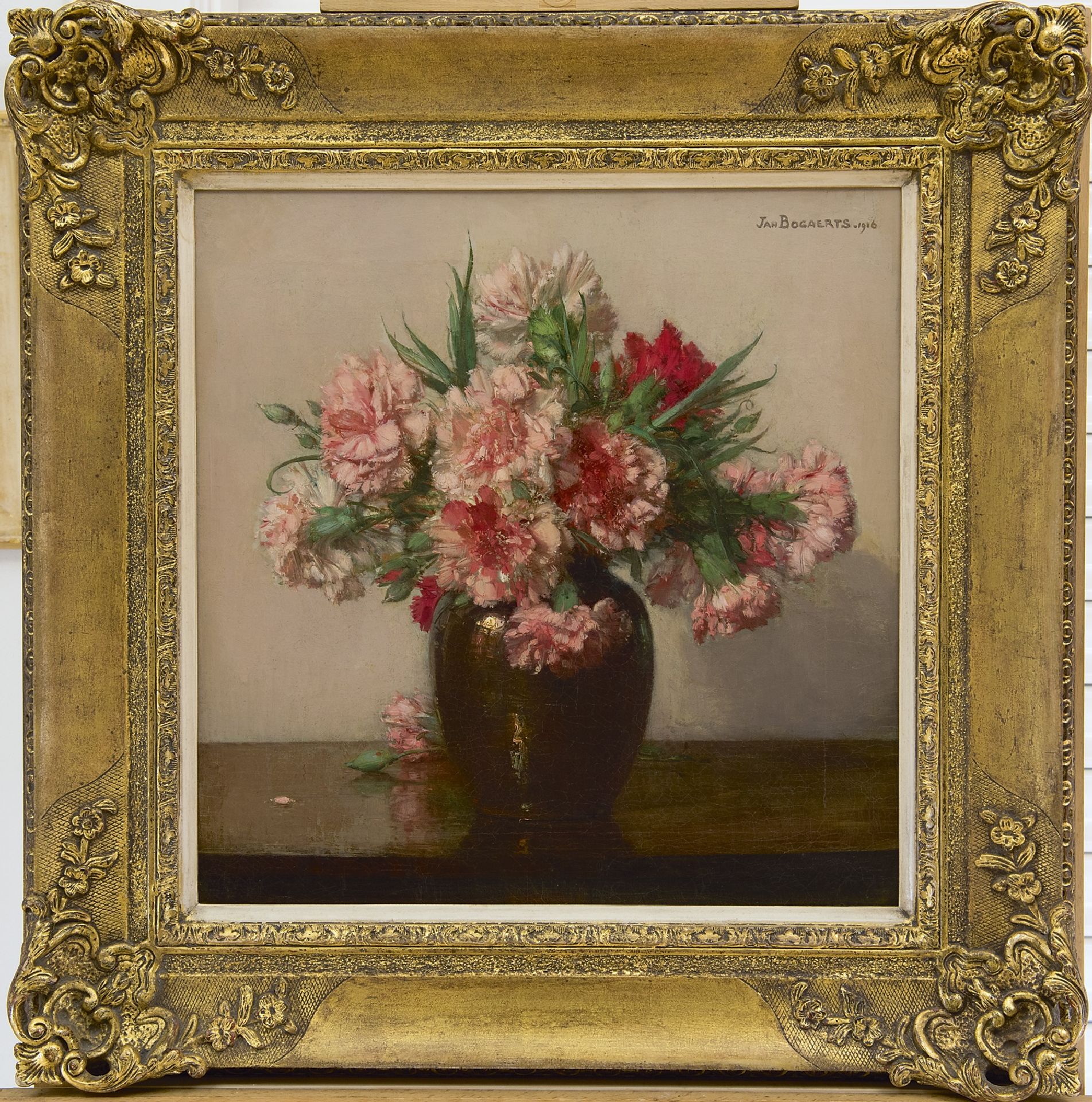 Na zijn opleiding aan de academies in Den Bosch en Antwerpen schilderde Jan Bogaerts aanvankelijk dromerige figuurstukken en sprookjesachtige parken en tuinen in de sfeer van het symbolisme. Hierin is de invloed te bespeuren van zijn Bossche leermeester Antoon van Welie. Vanaf 1915 maakte hij vooral stillevens, zowel van bloemen als van voorwerpen. Deze zijn realistischer verbeeld dan de landschappen, maar net zo stemmig en verstild. Voor zijn composities gebruikte Bogaerts zowel alledaagse attributen als antieke voorwerpen, zoals karaffen, flessen, schalen, beschilderde kistjes en juwelen, die hij zette tegen een sobere achtergrond. Zijn bloemstillevens vallen op door hun originele compositie en prachtige kleuren.