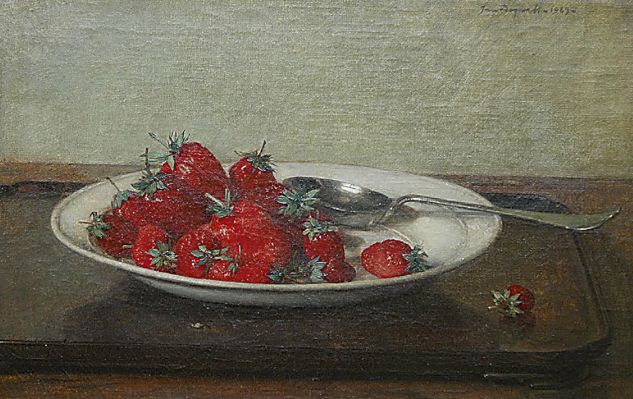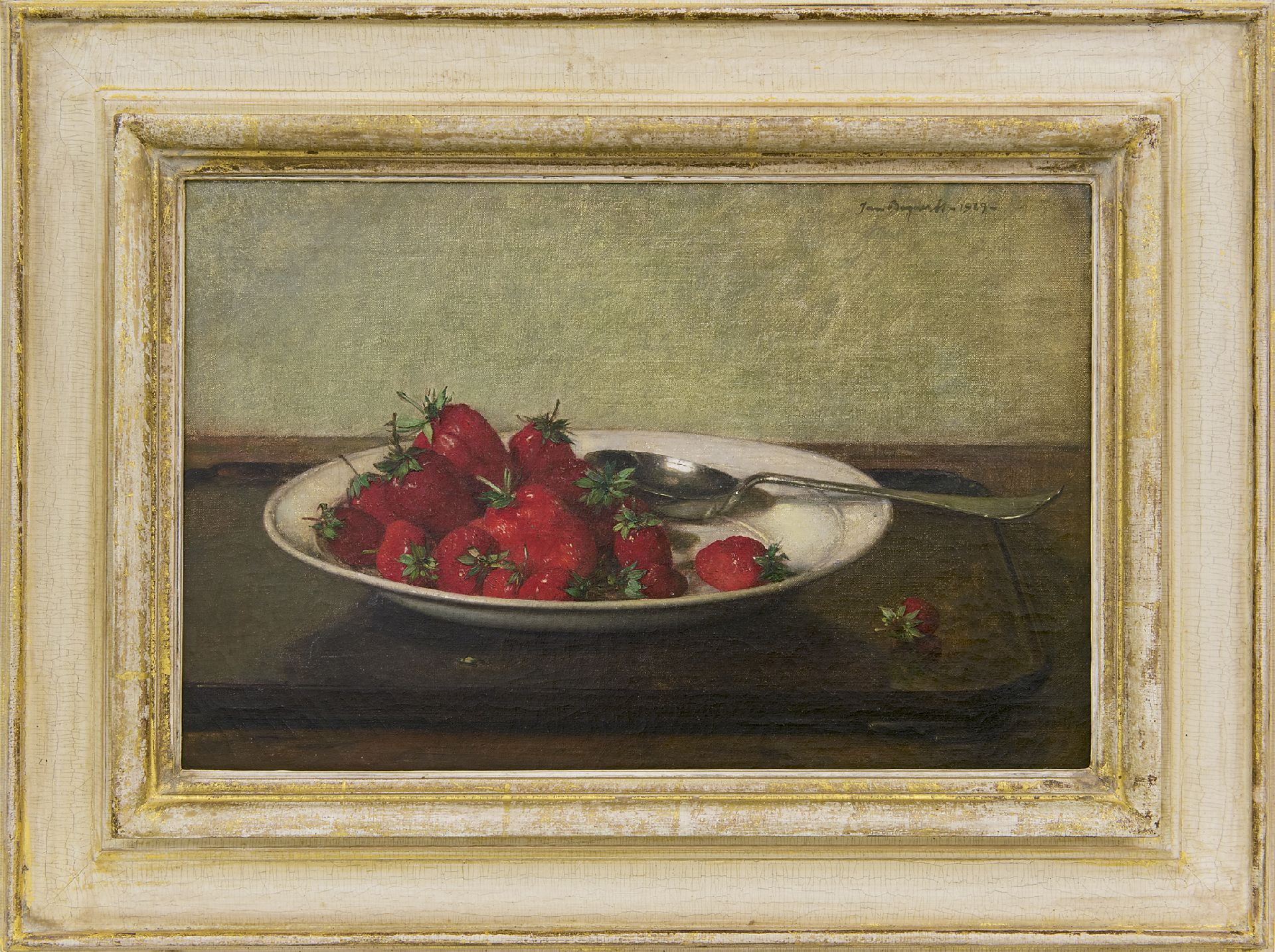 Jan Bogaerts kunstwerk • schilderij • voorheen te koop Stilleven met aardbeien op een aardewerken bord