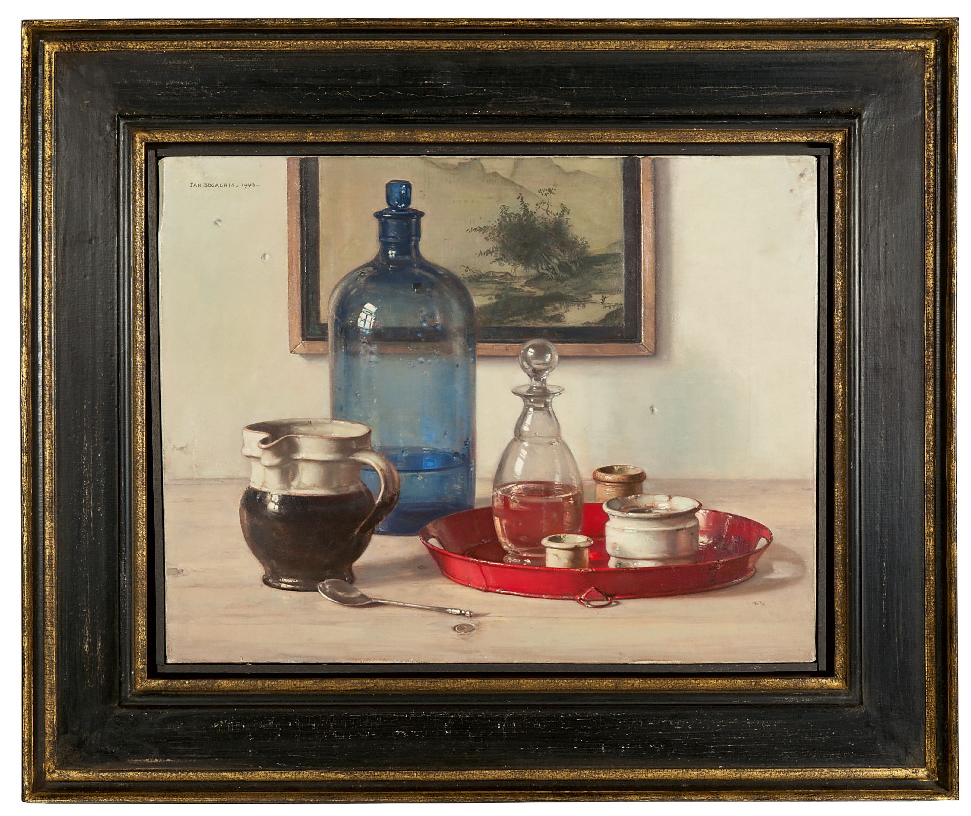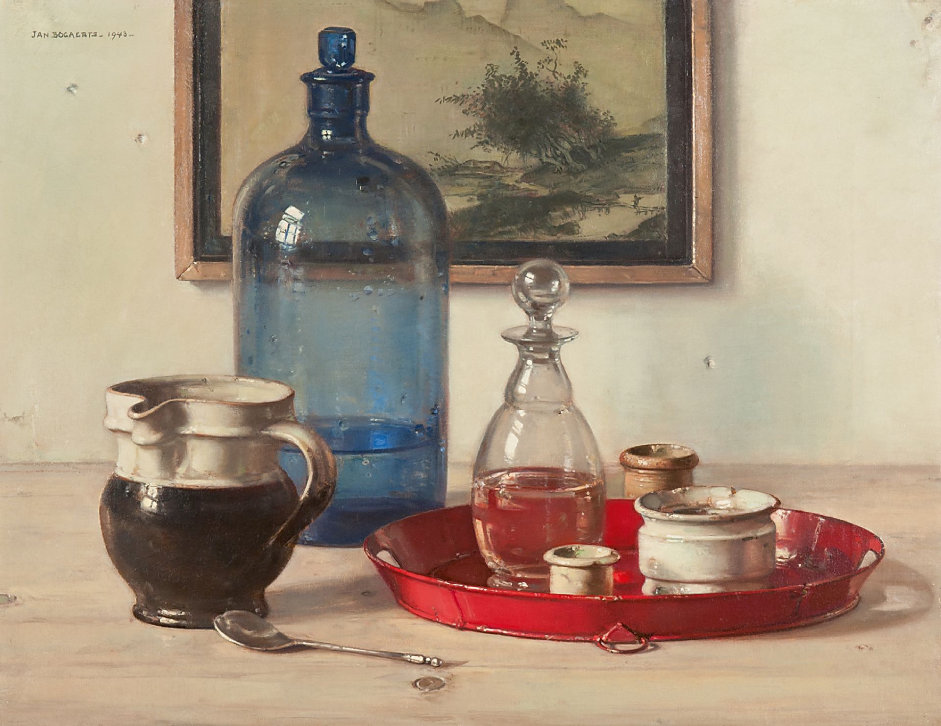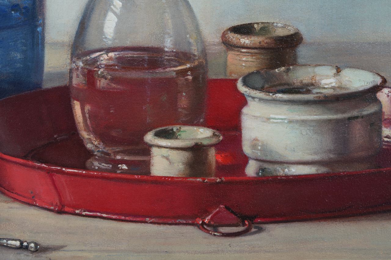 Jan Bogaerts kunstwerk • schilderij • te koop Stilleven met blauwe fles en potjes
