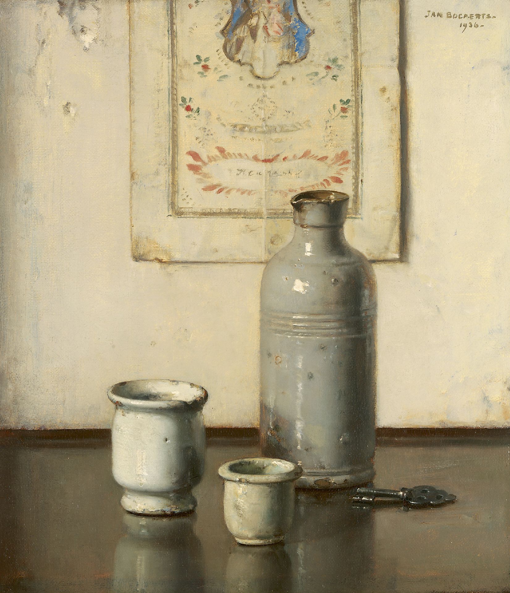 Jan Bogaerts kunstwerk • schilderij • voorheen te koop Stilleven met ronde zalfpotten