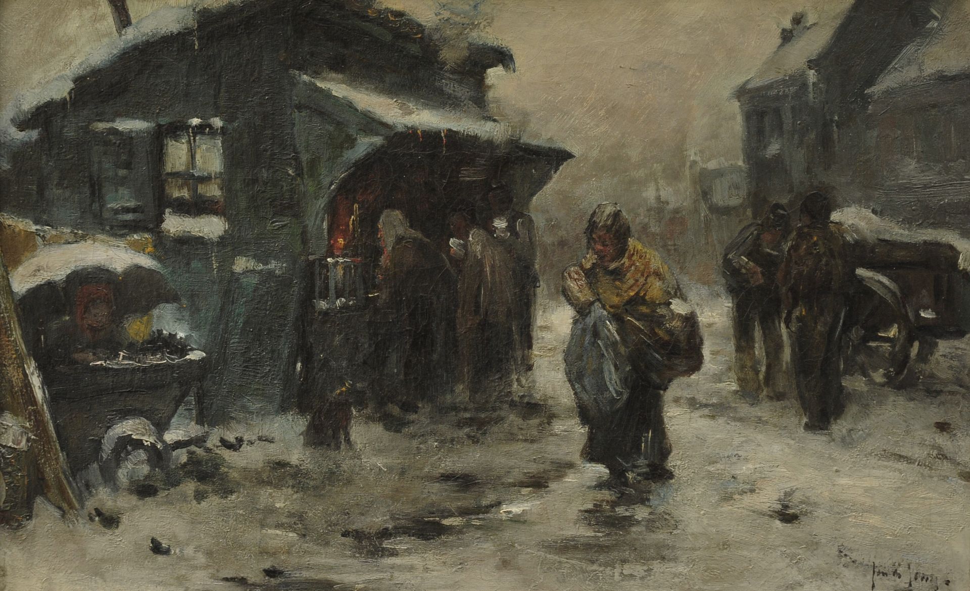 Jan de Jong kunstwerk • schilderij • voorheen te koop Dorpsstraat met kraampjes in de sneeuw