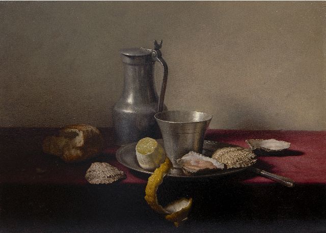 Jan Eversen kunstwerk • schilderij • te koop Stilleven met Westerwaldkruik, roemer, citroen en mosselen