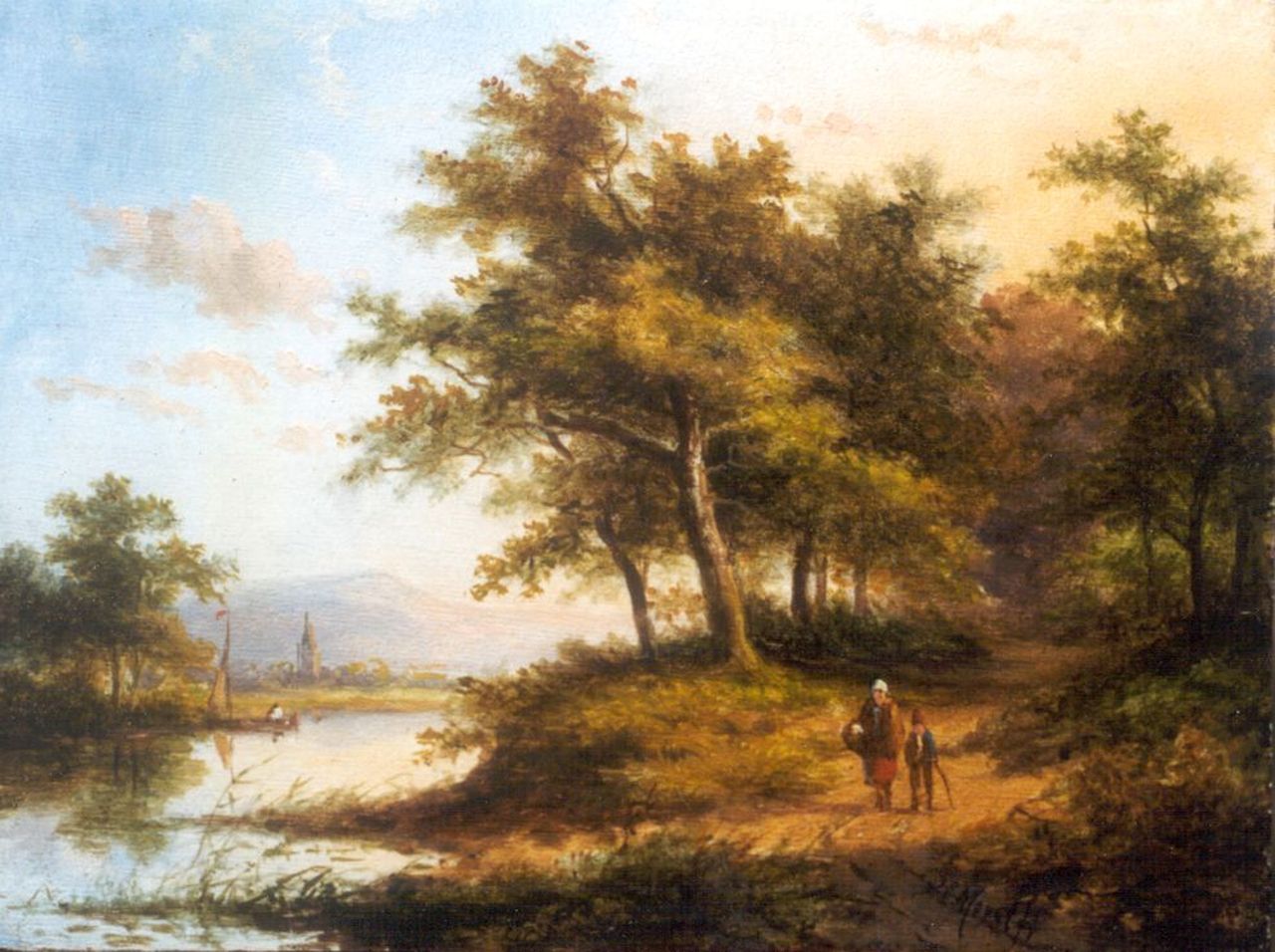Jan Evert Morel II kunstwerk • schilderij • voorheen te koop Bosgezicht met rivier en wandelaars