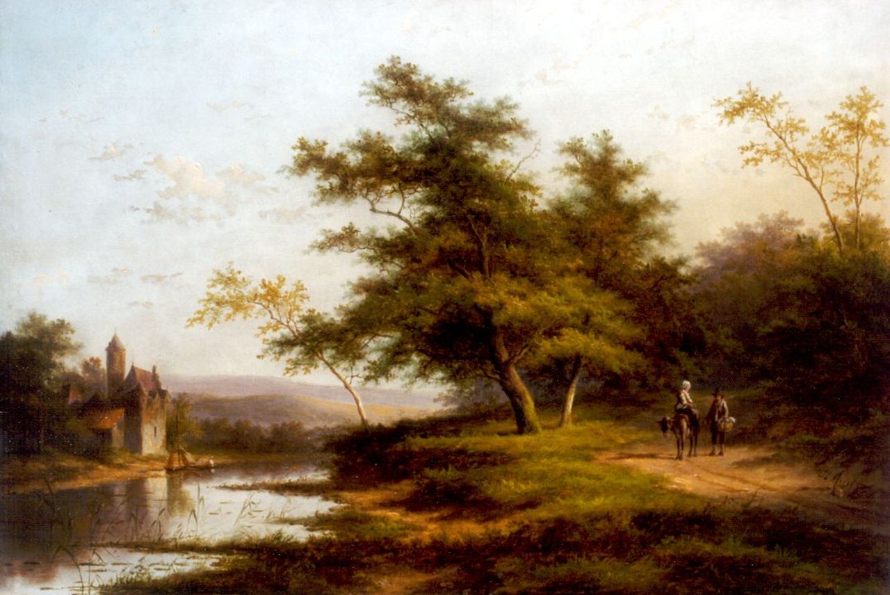 Jan Evert Morel II kunstwerk • schilderij • voorheen te koop Landvolk op een pad langs de rivier