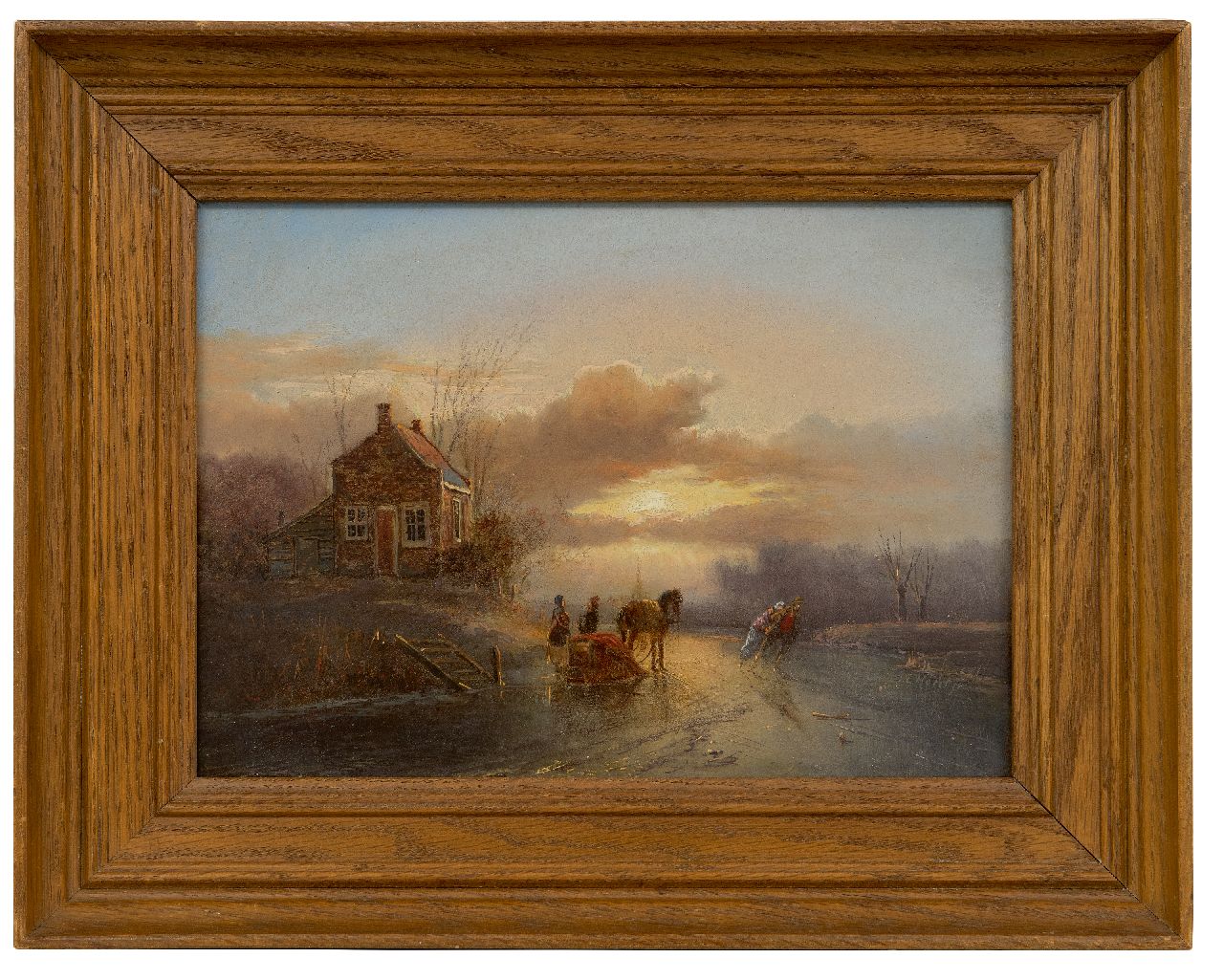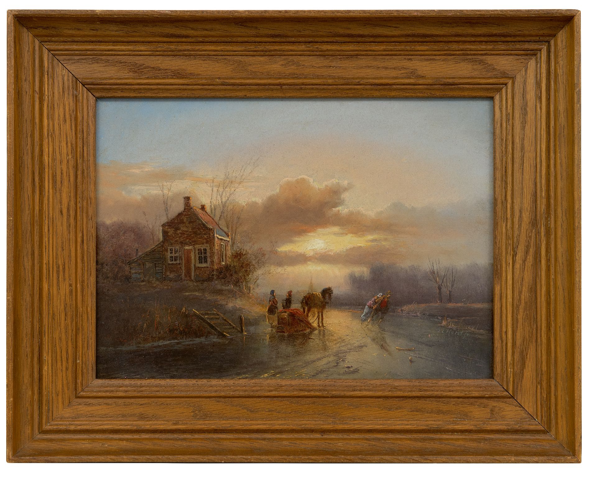 Jan Evert Morel II kunstwerk • schilderij • te koop Paardenslee en schaatsers bij zonsondergang