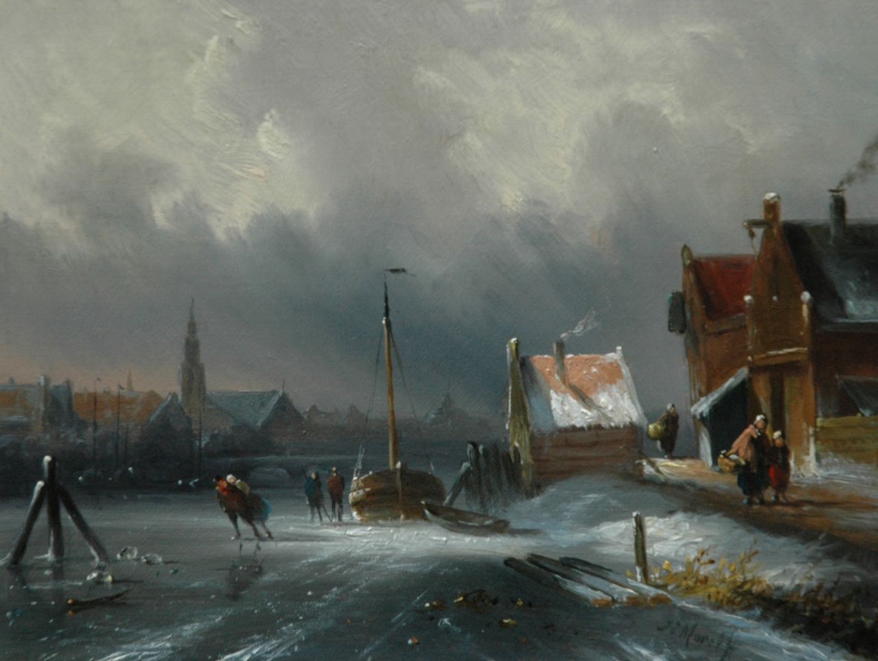 Jan Evert Morel II kunstwerk • schilderij • voorheen te koop Winters gezicht op een stadsgracht met schaatsers